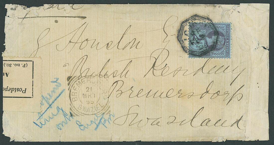 Incoming Mail: 1895 (9 Feb.), Censored envelope from London, franked 2½d. with octagonal cancellation, Bremersdorp/Swaziel squared circle datestamps of 13.3 (on reverse) and 21.3 (on the front); small faults but rare. Photo