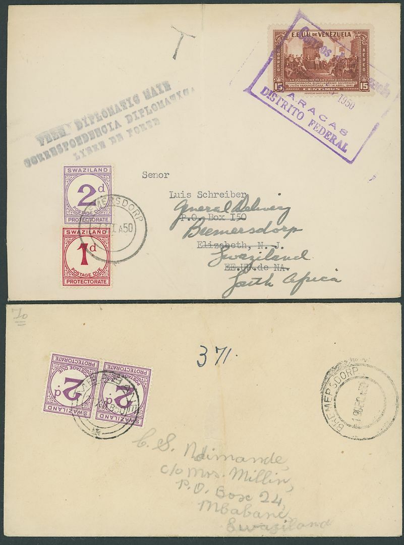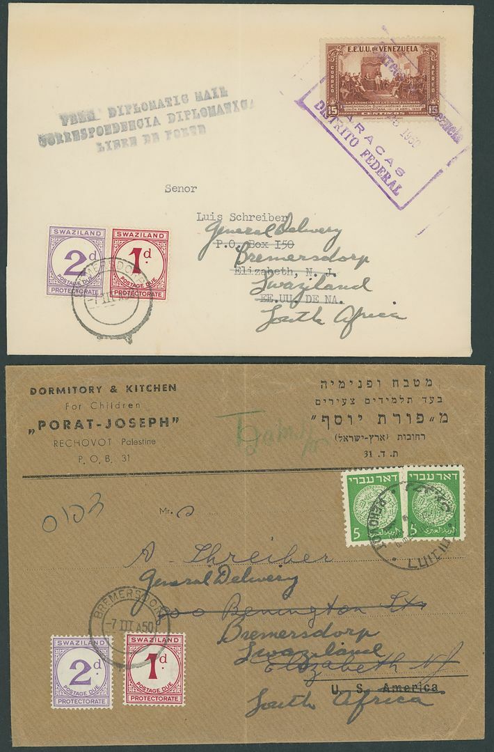 Postage Due: 1950, two covers from Venezuela to the United States, each re-directed and taxed by 1d. and 2d. Postage Dues, stampless envelope to Mbabane franked 2d. pair, 1950 envelope from Rehovot (Israel) franked first Coins 5pr. (2) taxed by 1d. and 2d. on arrival; good to fine