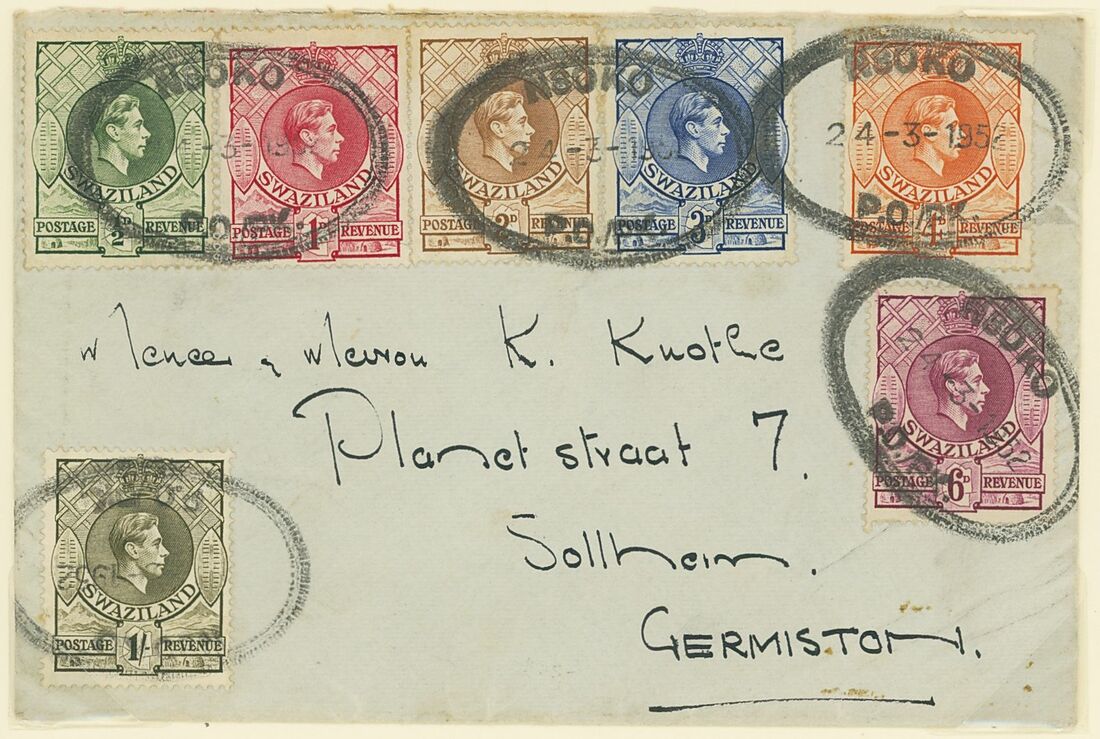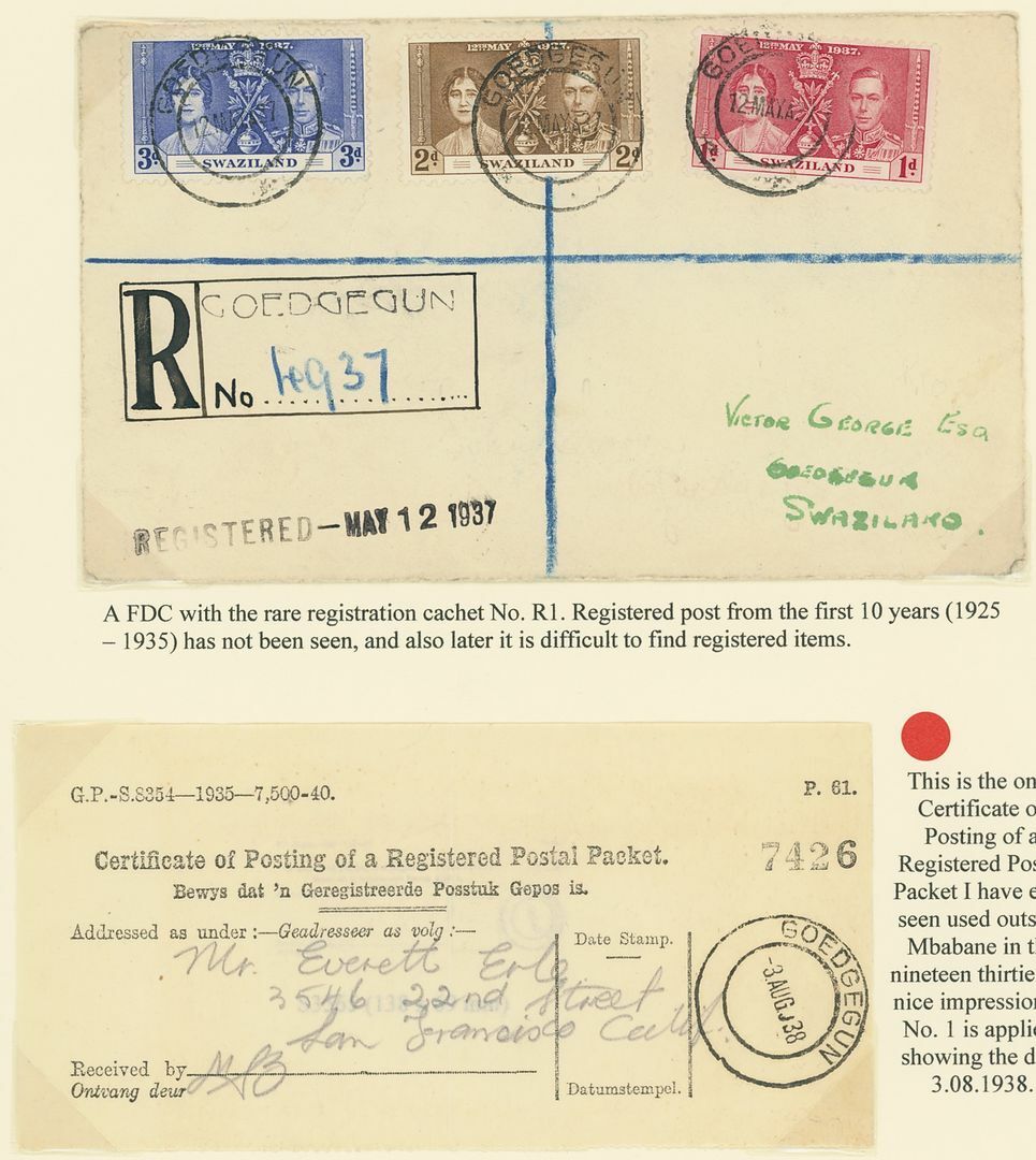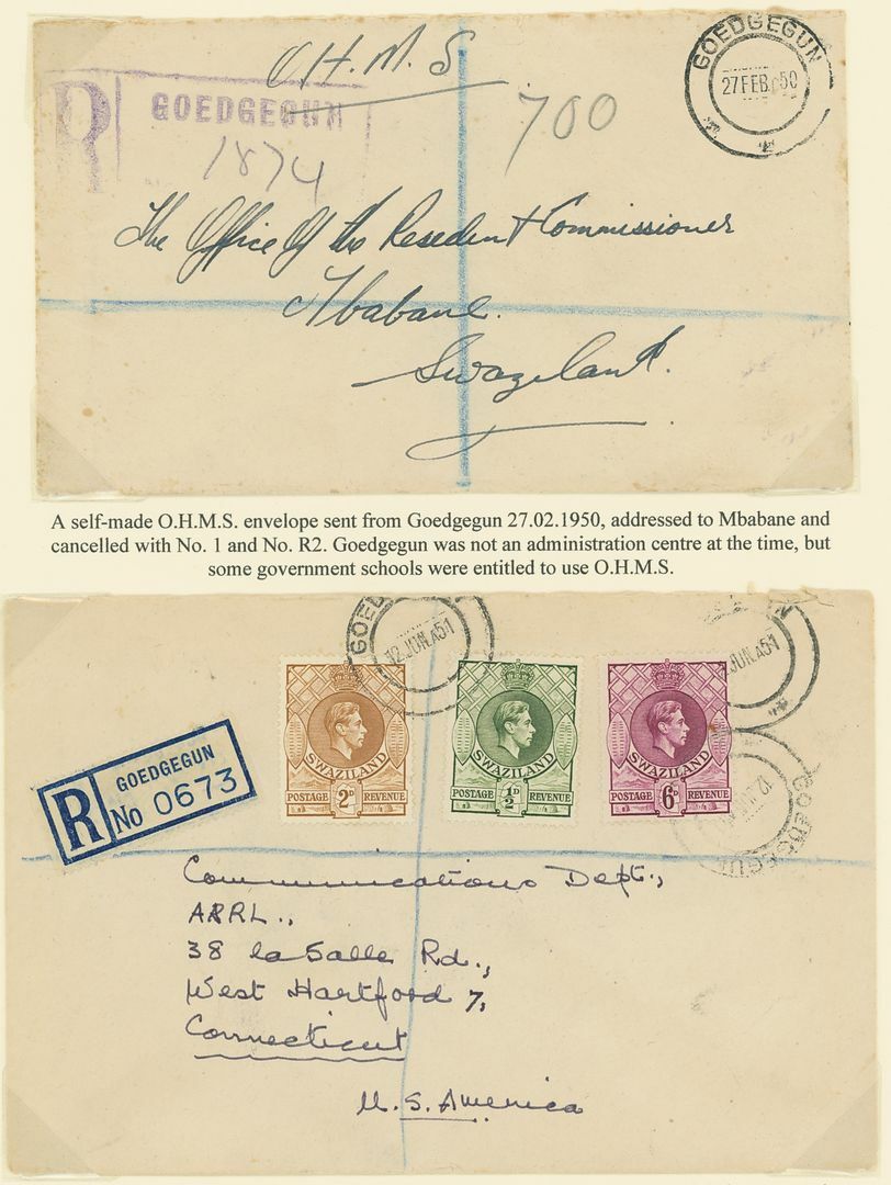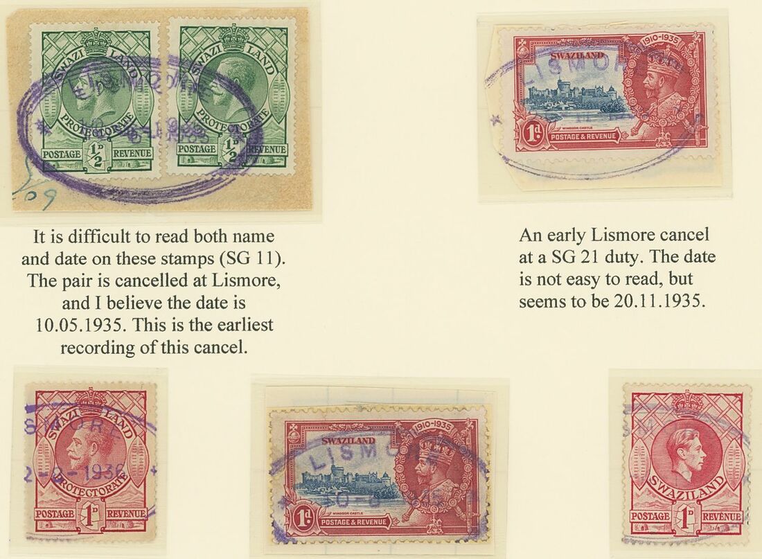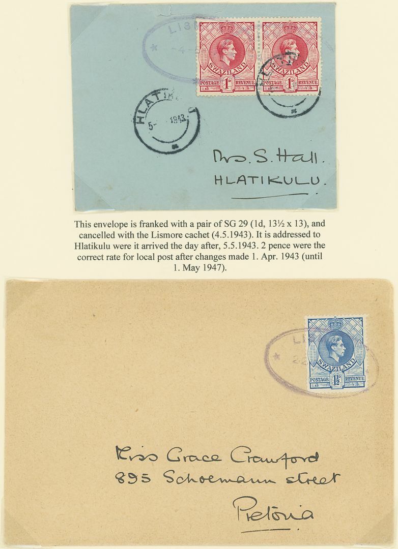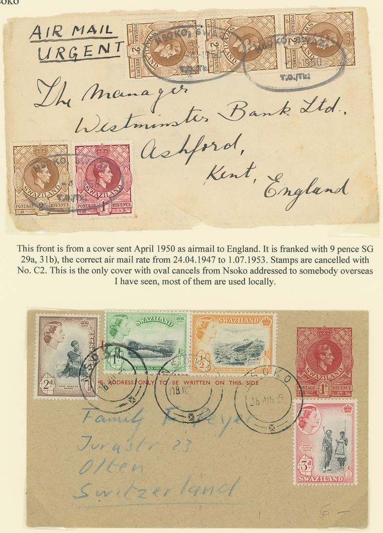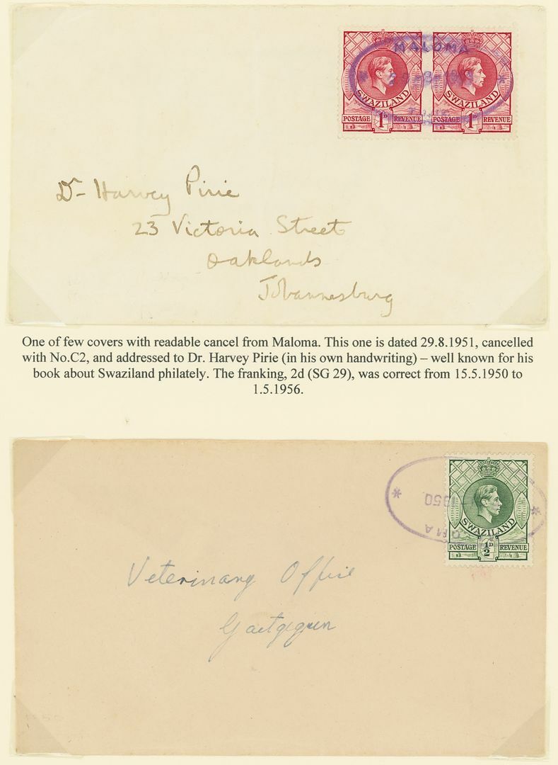 A collection of covers, post cards and used stamps on exhibition pages with a variety of scarce offices represented including Goedgegun (4), Lismore (7), Maloma (3), Nsoko (3), Emblembe (8), Lubuli (3), Singceni (2), Sipofaneni Bridge telegraph cachet used on envelope sent locally, Mhlumeni (3), Mankaiana (5), Sicunusa (10), Malkerns (4), Dwaleni (6) and Stelle, the ficticious post office created by Madame Joseph, an example of this cachet used on a KGV 5/- Revenue; a good to fine group for the specialist