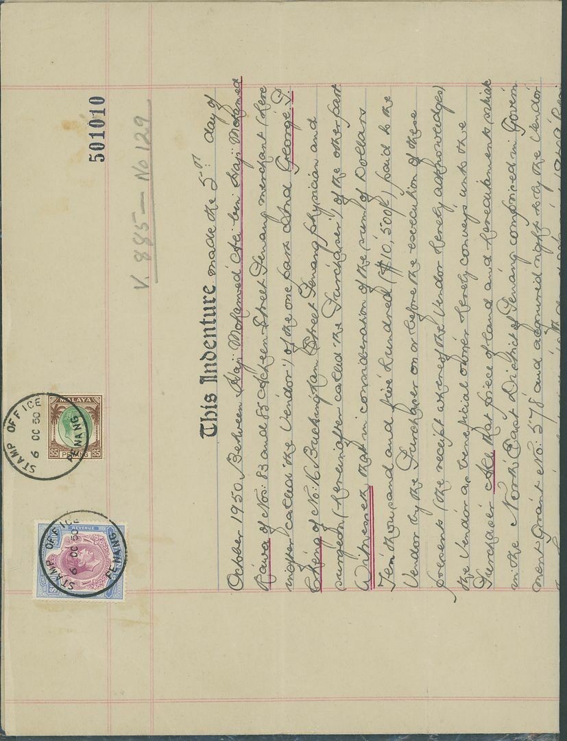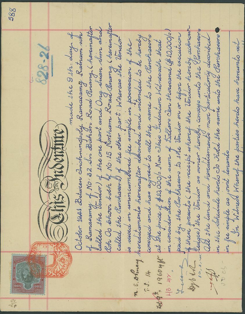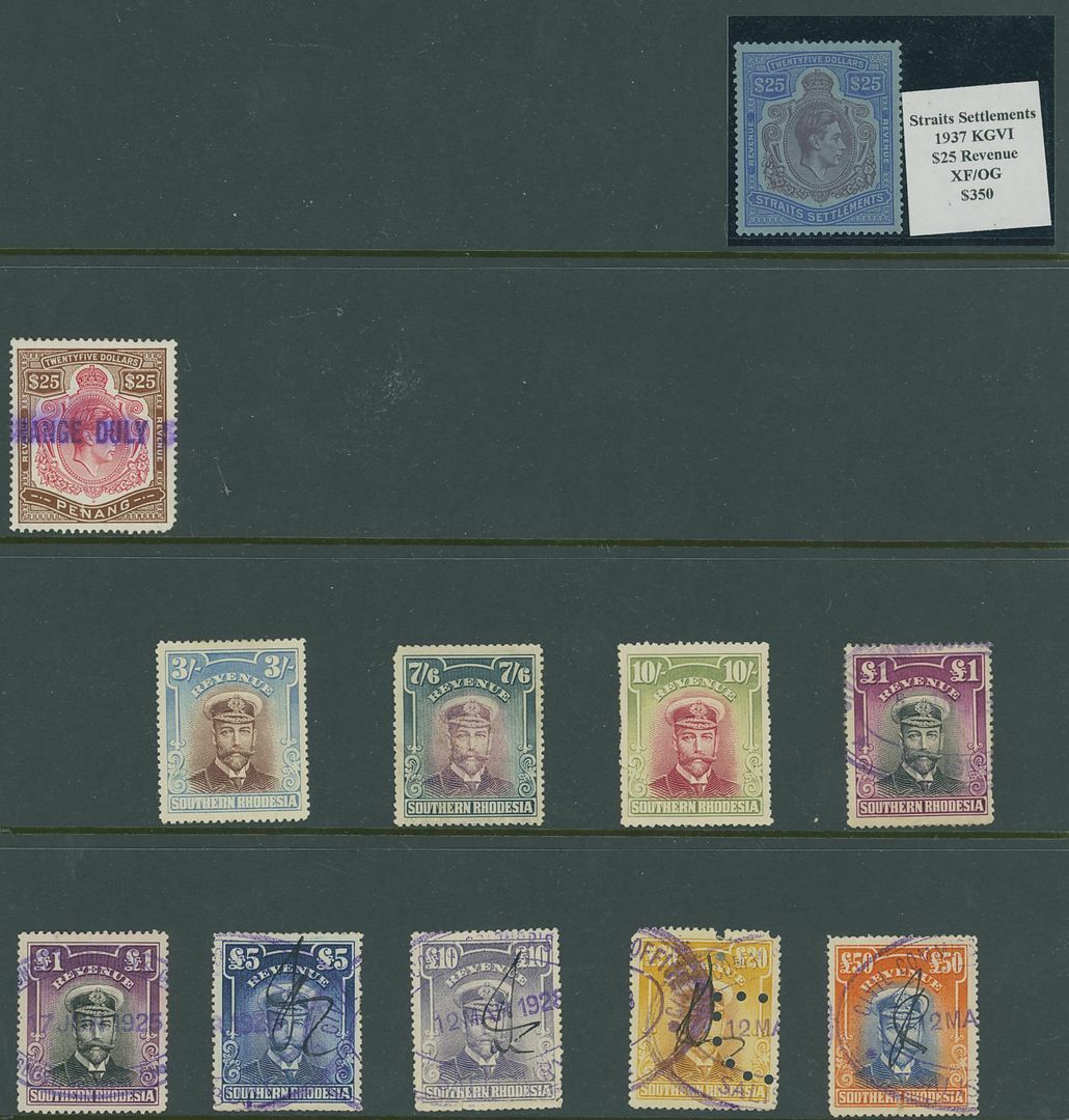 A small group of revenues with Indenture (6) 1941 bearing Straits Settlements KGVI $100, 1950 bearing Penang KGVI $5 and $100, 1954 bearing Singapore KGVI $500, $100 (3), $25, $5 (4), $2 and $1, 1959 bearing QEII $100 (4) and 1967 bearing $100 (3) and $25 (2), also KGVI $25 revenue, large part original toned gum; also Southern Rhodesia 1924 3/-, 7/6d. and 10/- unused, £1 (2), £5, £10, £20 and £50 used (bends).