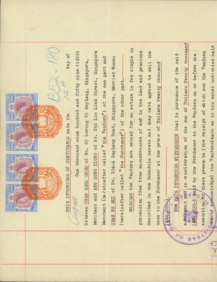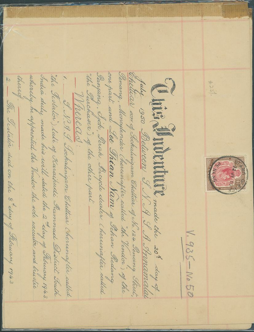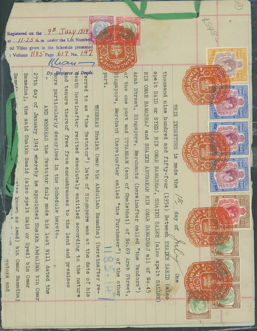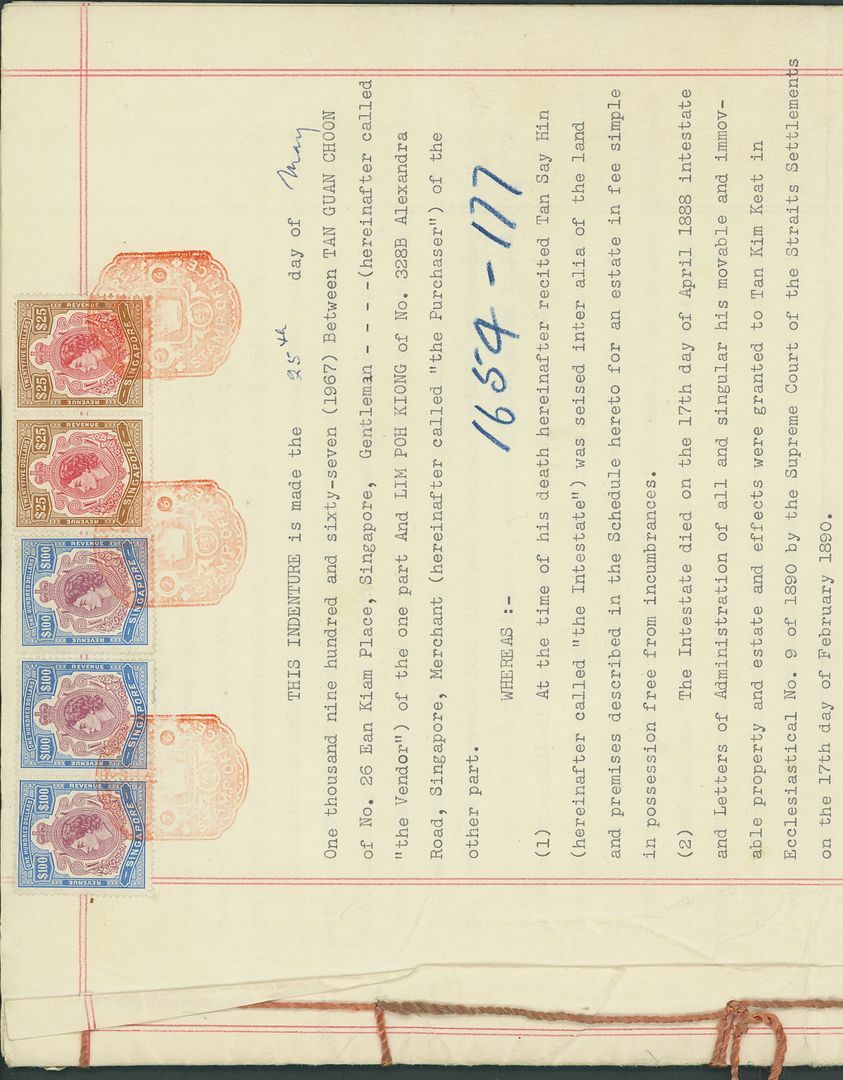 A small group of revenues with Indenture (6) 1941 bearing Straits Settlements KGVI $100, 1950 bearing Penang KGVI $5 and $100, 1954 bearing Singapore KGVI $500, $100 (3), $25, $5 (4), $2 and $1, 1959 bearing QEII $100 (4) and 1967 bearing $100 (3) and $25 (2), also KGVI $25 revenue, large part original toned gum; also Southern Rhodesia 1924 3/-, 7/6d. and 10/- unused, £1 (2), £5, £10, £20 and £50 used (bends).