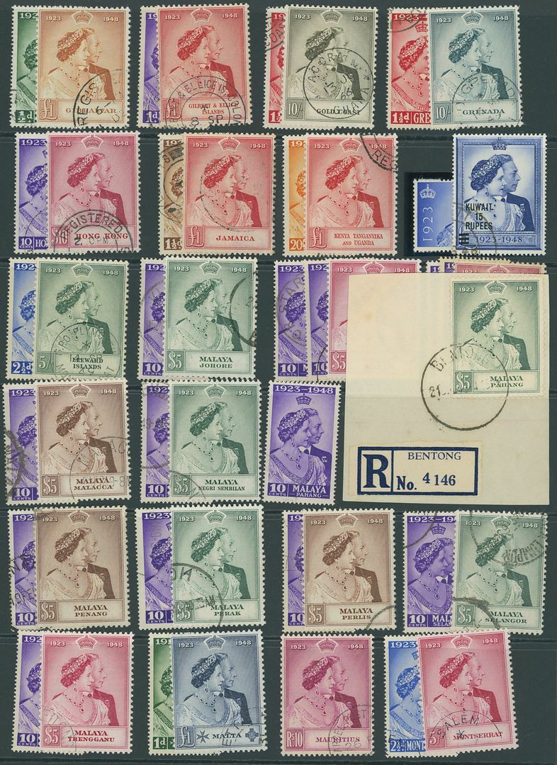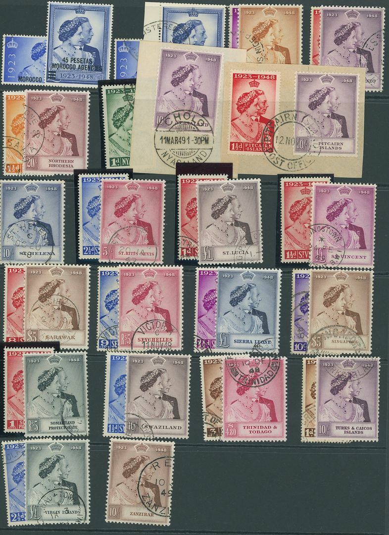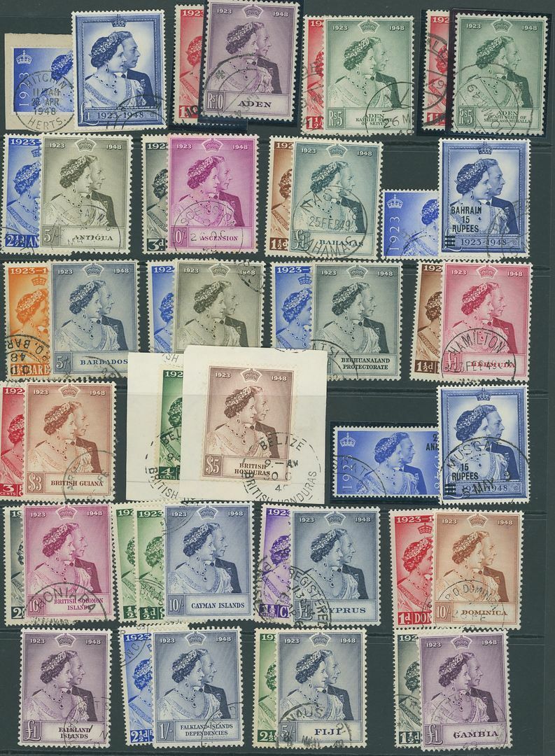 1948 Silver Wedding an almost complete used set missing only the lower values of Falklands, Mauritius, St. Helena and Zanzibar, but with duplicated lower values of Cayman and Kedah, slightly mixed condition, generally fine. S.G. £2,700++