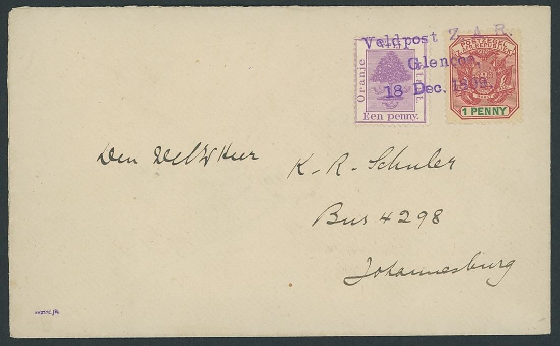 1899 (18 Dec.) envelope to Johannesburg bearing Orange Free State 1d. and Transvaal 1d. tied by a good strike of "Veldpost Z.A.R./Glencoe,#18 Dec. 1899." struck in purple with the arrival c.d.s. on the reverse (21.12). Philatelic