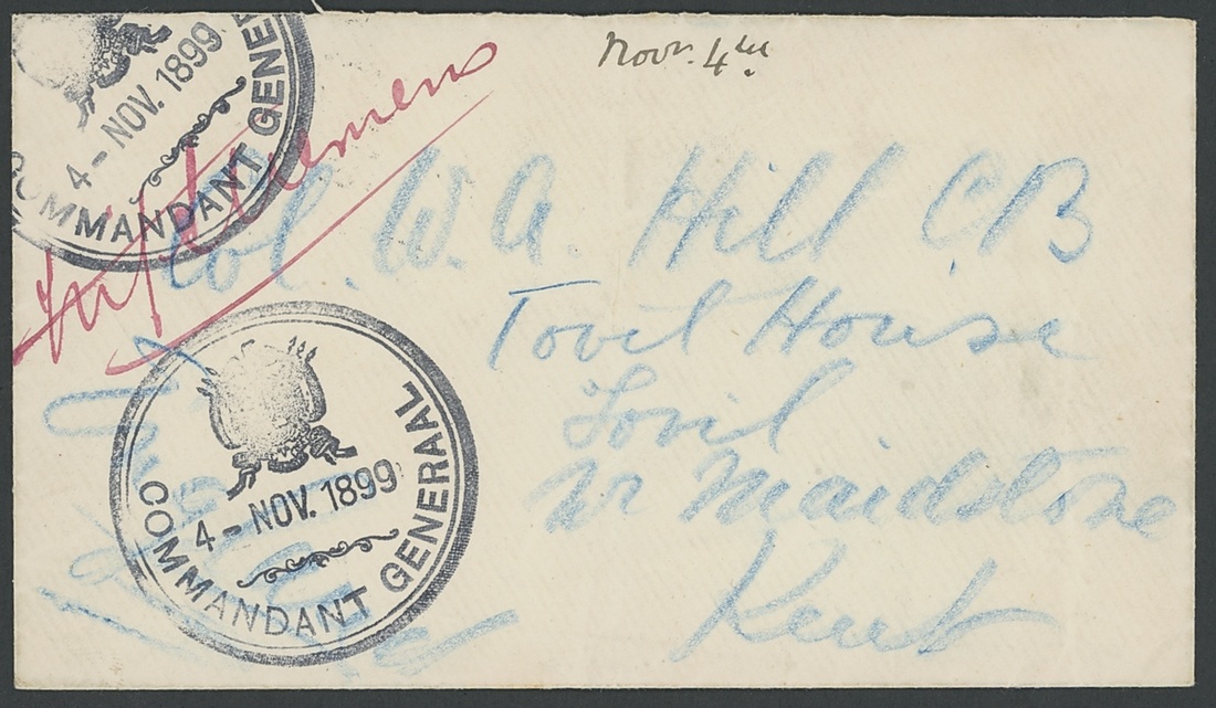 1899 (4 Nov.) stampless envelope to Maidstone, Kent bearing two fine strikes of the Arms "