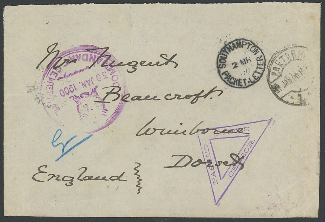 1900 (30 Jan.) stampless envelope to Wimborne, Dorset from "Bourke hospital Pretoria, 20-1-00" with a good strike of Arms "