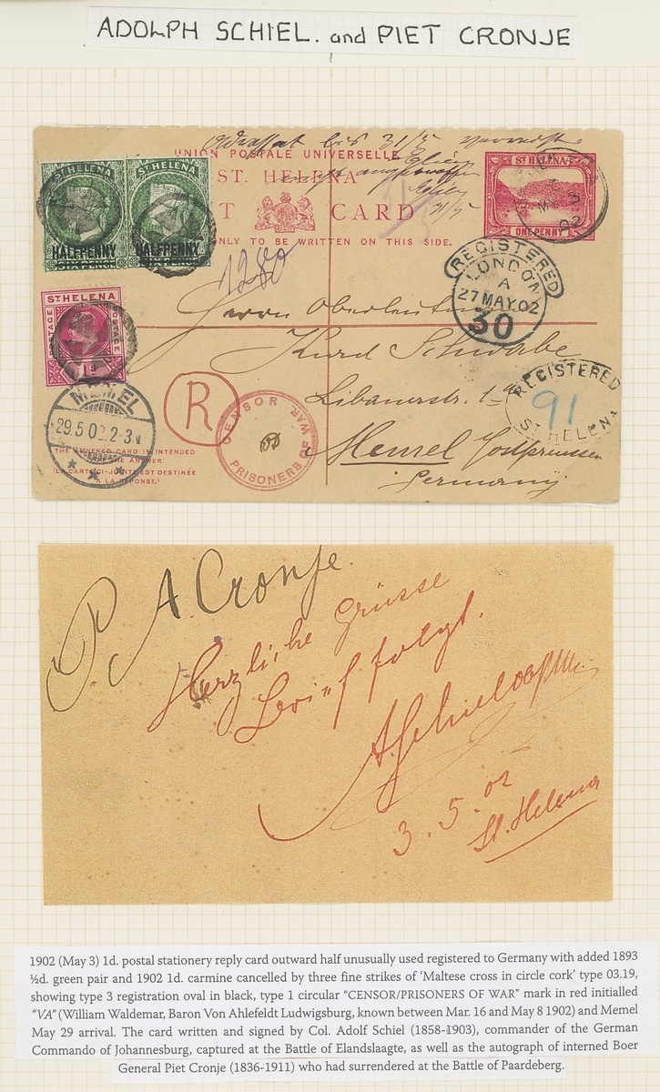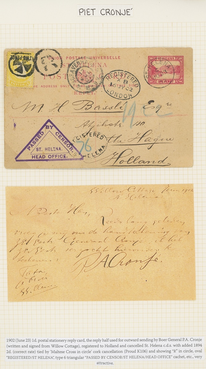 1900-02 a small group of 1d. stationery cards with 1900 (June) card to Hamburg bearing dumb circular censor handstamp initialled "EW"; 1902 (3 May) front section of reply card registered to Germany uprated ½d. pair and 1d. cancelled by dumb cross in circle with dumb circular censor handstamp in red initialled "VA" and St. Helena registered oval; 1902 (23 June) card registered to Holland, uprated 2d. tied by dumb cross in circle with large "R" in circle alongside, triangular Head Office censor handstamp in purple, St. Helena and London registered ovals; generally good. Two are signed by Col. Adolf Schiel and one by General P.A. Cronje. (3 cards)