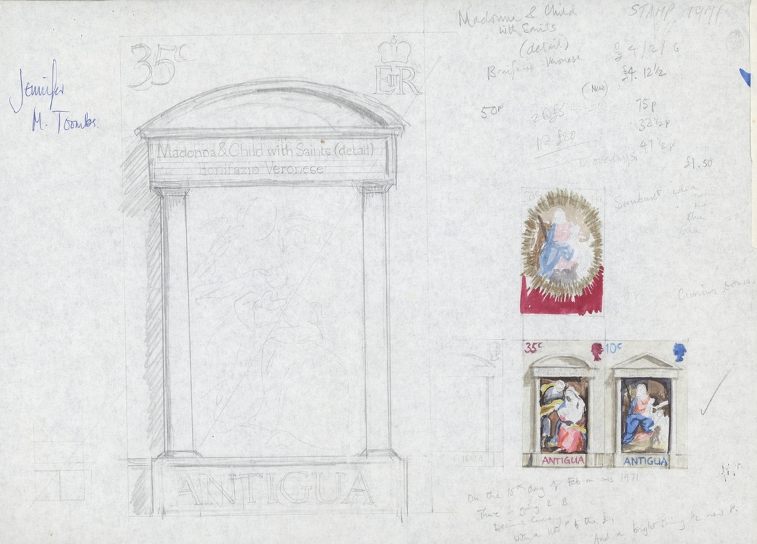 Preliminary pencil only (15) or pencil and watercolour (1) essays executed by Jennifer M Toombs on translucent paper or thin paper including the proposed design for the 1971 Antigua Easter FDC and Christmas stamps and two for the Gibraltar 1975 Michelangelo stamp, eight signed by the artist. Mixed condition, a wonderful lot for the art lover.