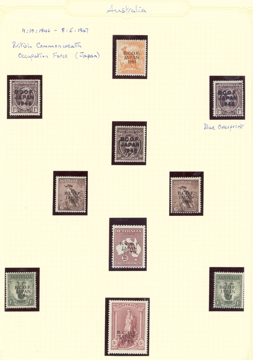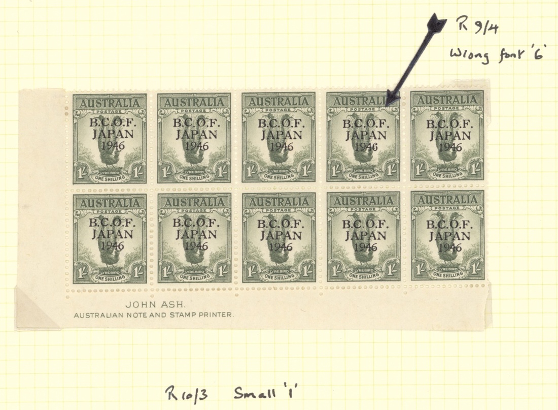 1946-47 set of ten to 5/- on thick paper including 1d. with blue-black overprint (unmounted), the others lightly mounted; also 1/- in a John Ash imprint block of ten with [9/4] showing wrong fount 6' and [10/3] small