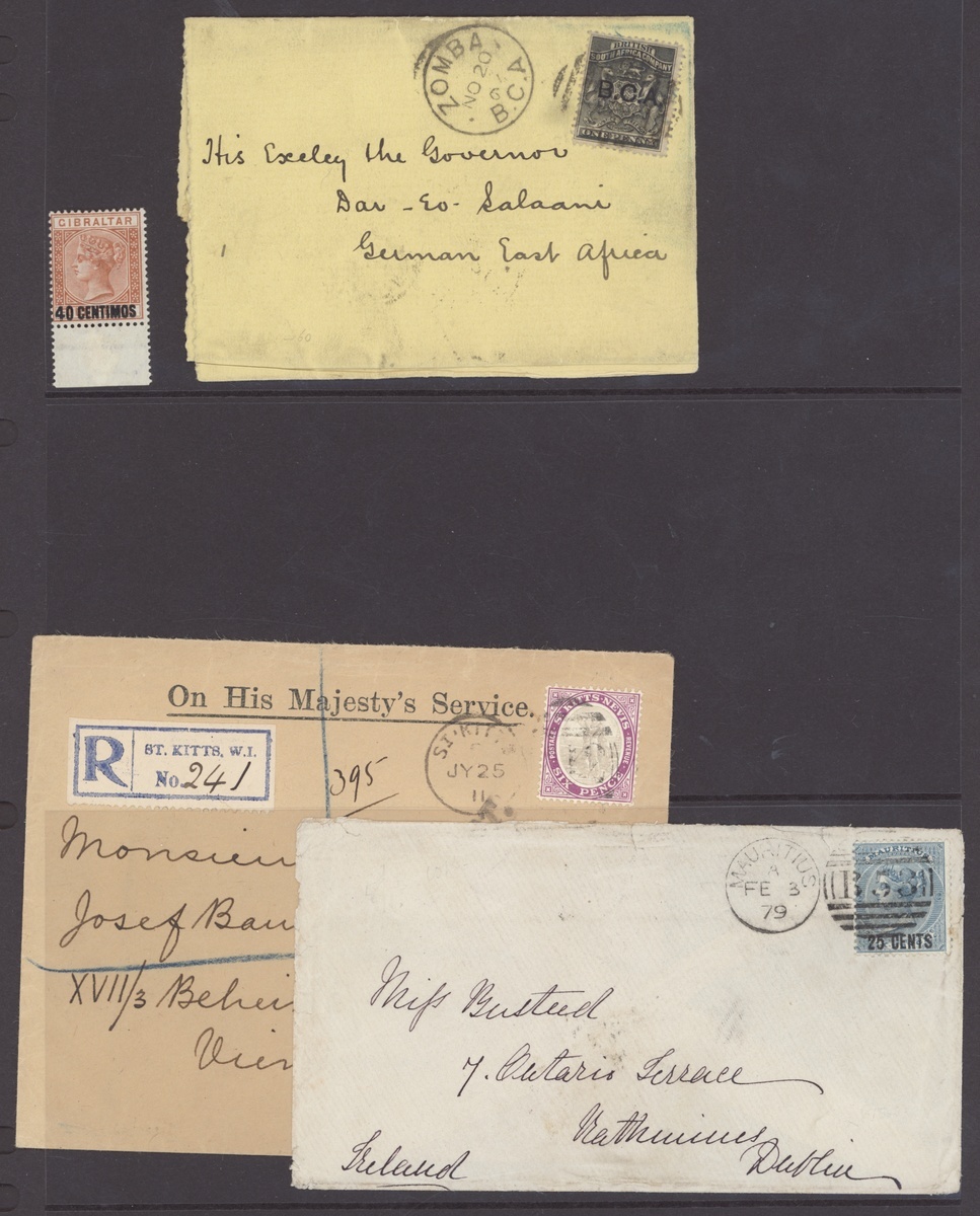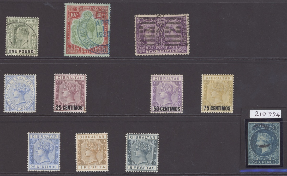 Small Empire selection (15), comprising Bahamas 1902 £1, Bermuda 1918-22 10/-, Canada 1897 $2, Gibraltar 1886-87 2½d., 1889 25c. on 2½d., 40c. on 4d., 50c. on 6d., 75c. on 1/-, 1889-96 25c., 1p. and 5p., Mauritius 1878 25c. on 6d. on cover to Dublin, Nyasaland 1891 1d. on cover from Zomba to German East Africa, St. Helena 1856 imperf. 6d. good used with large margins (R.P.S. Certificate 2011), St. Kitts Nevis 1911 cover Registered to Vienna franked Columbus 6d., all used except the Gibraltar, chiefly fine