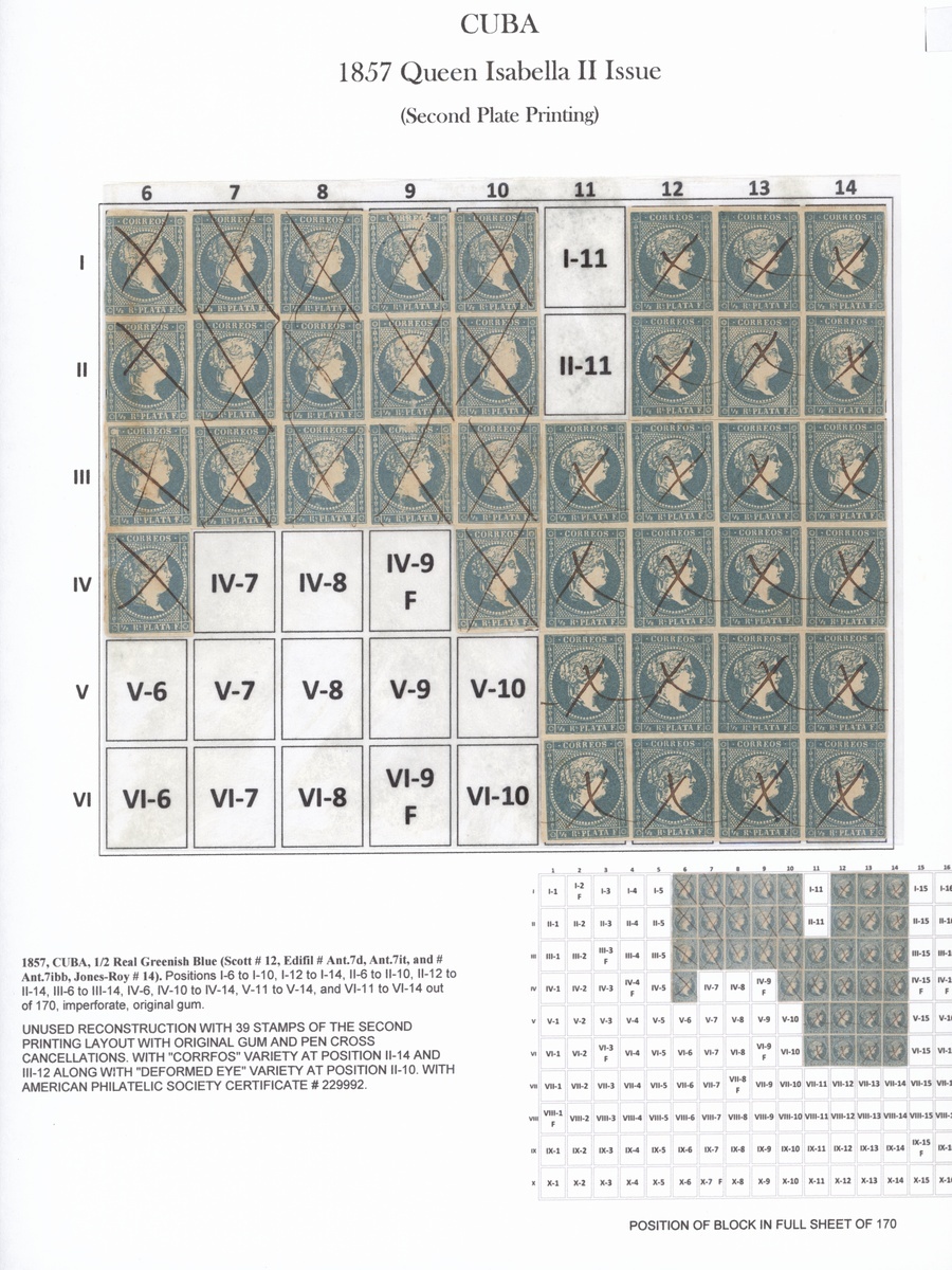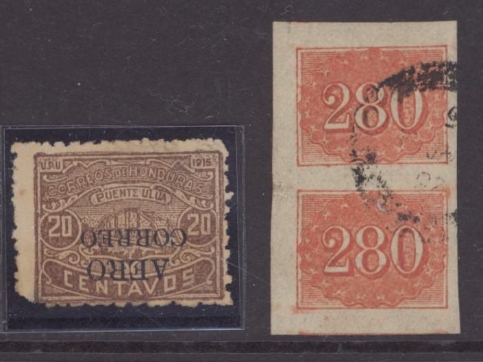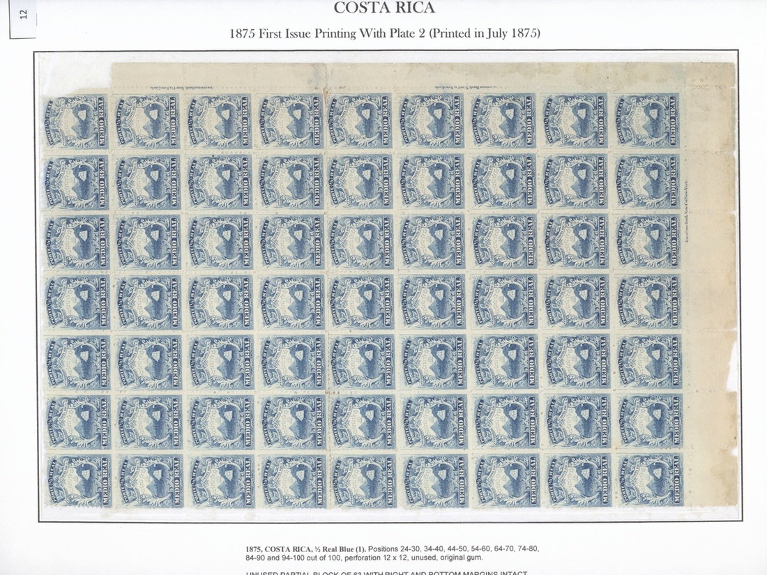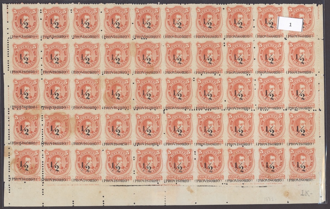Latin America selection including Argentina 1882 ½c. on 5c. Large 'P' variety block of fifty from the lower part of the sheet, mint with G. Jalil certificate (2020), Brazil 1861 280r. thin paper 60-70 microns, vertical pair used with A.P.S. Certificate (2020), Costa Rica 1875 medio Real block of sixty-three mint, Cuba 1857 ½r. partially re-constructed plate (39) pen cancelled used showing positional varieties with A.P.S. Certificate (2019), Honduras 1925 20c. air mail variety overprint inverted unused with P.F. Certificate. Mixed condition, an unusual group.