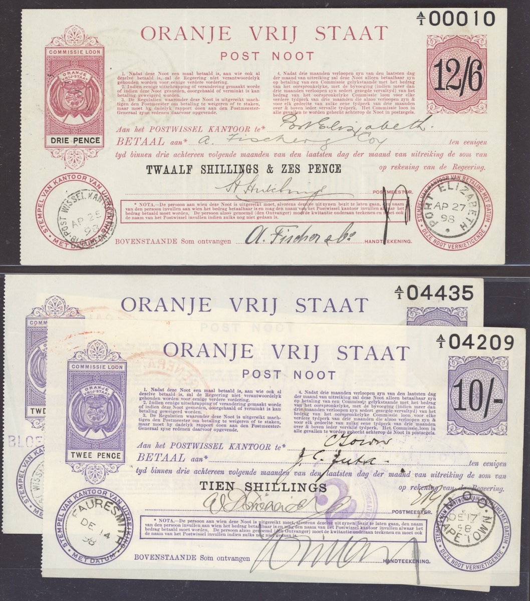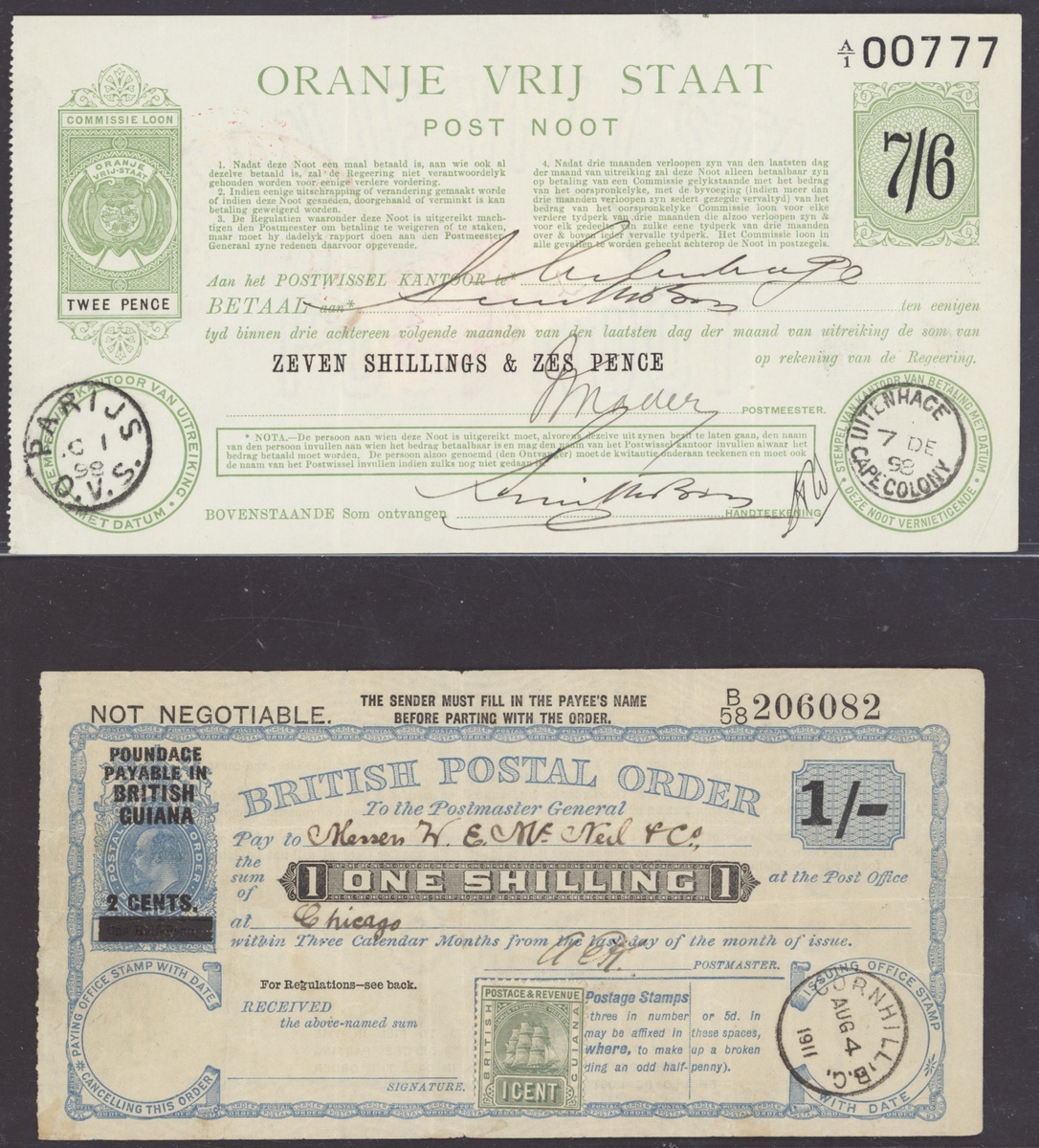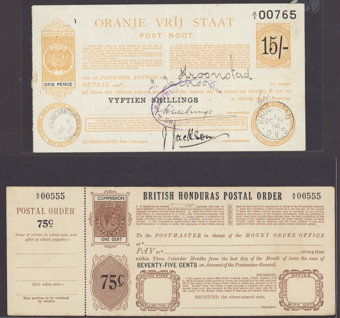 Postal Orders selection (8) including British Honduras KGVI 75c. (unused), British Guiana 1911 1/- used, Orange Free State 1898-99 (5) used. Mixed condition, an unusual lot.