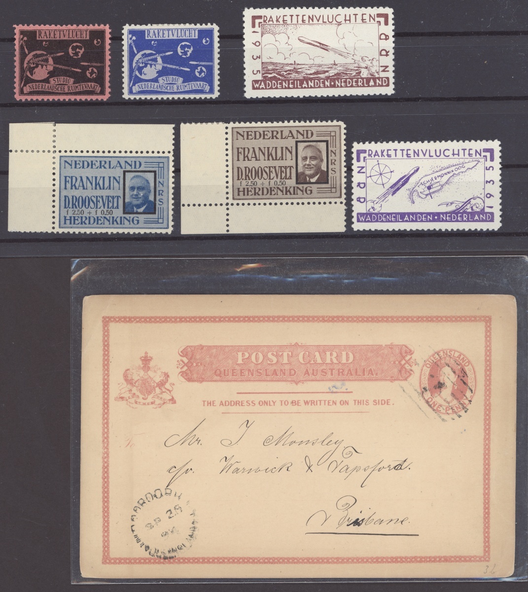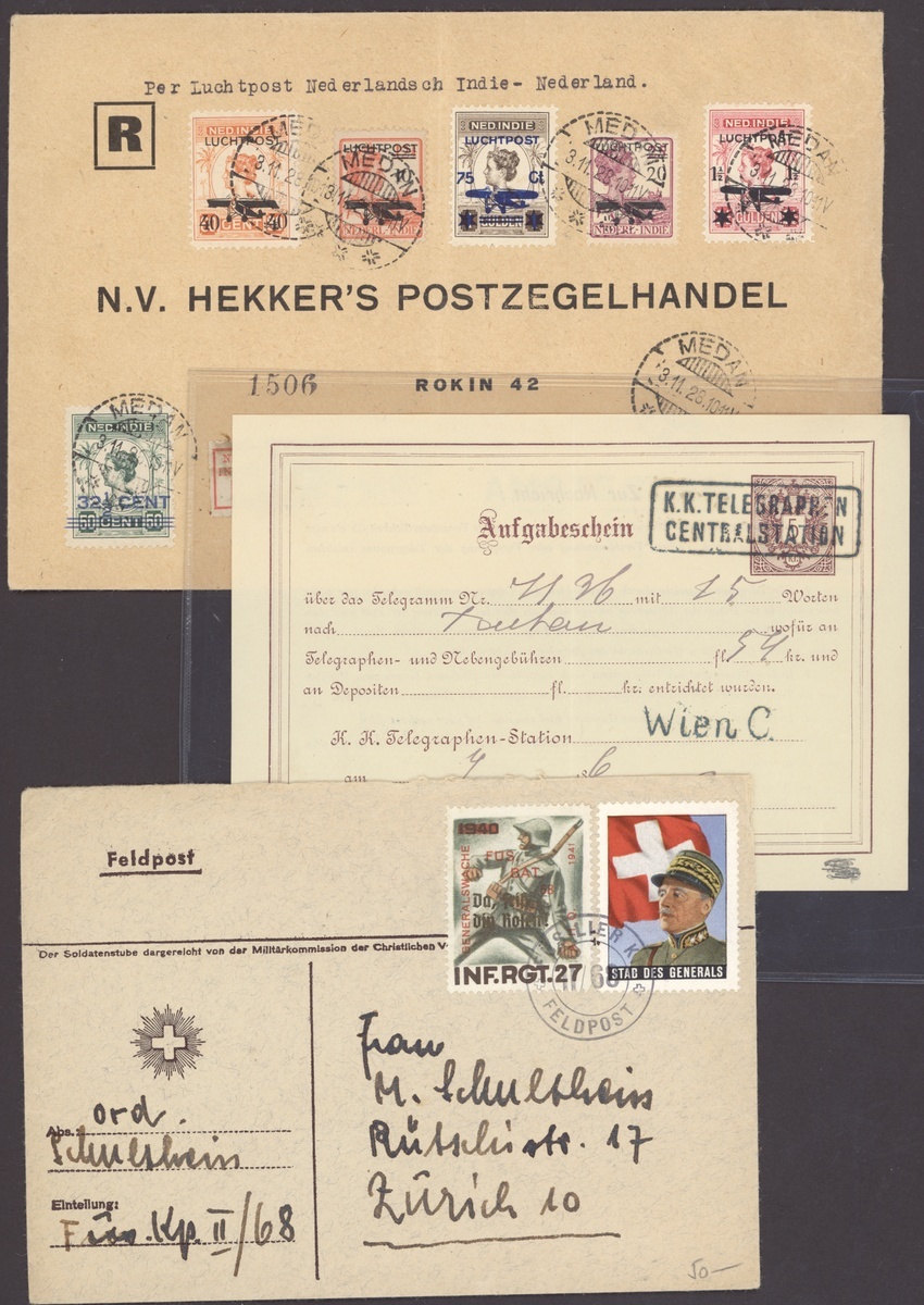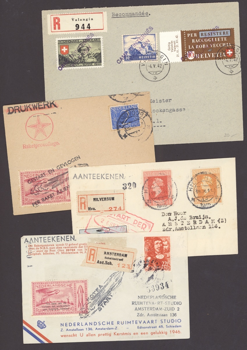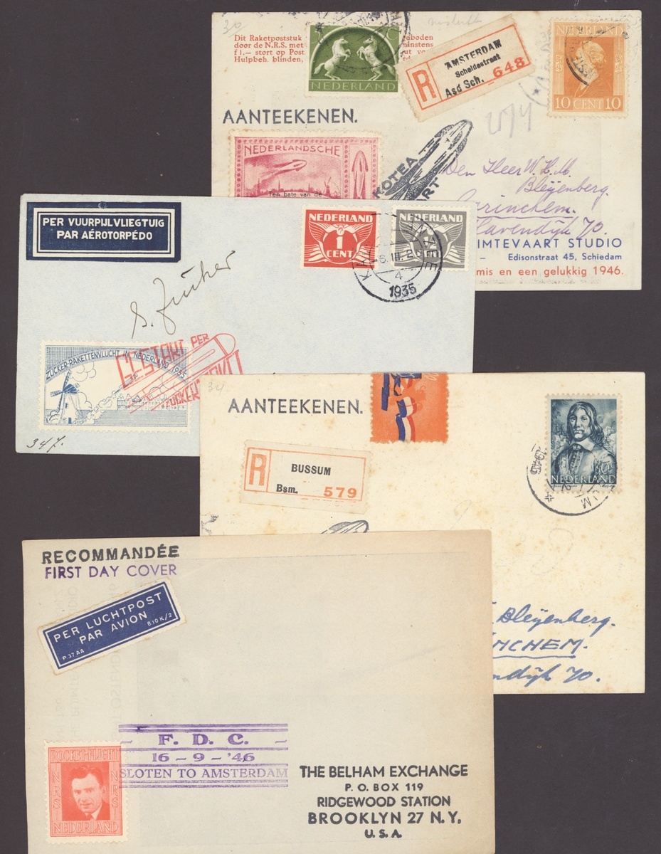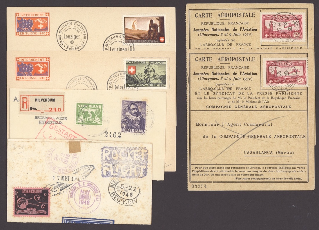 Postal history selection (40) including Russia 1934 envelope registered air mail express to England, Lichtenstein envelope registered and censored, selection of Netherlands rocket mails plus extra loose labels, Switzerland range of internment camps cards. Mixed condition, a useful group.