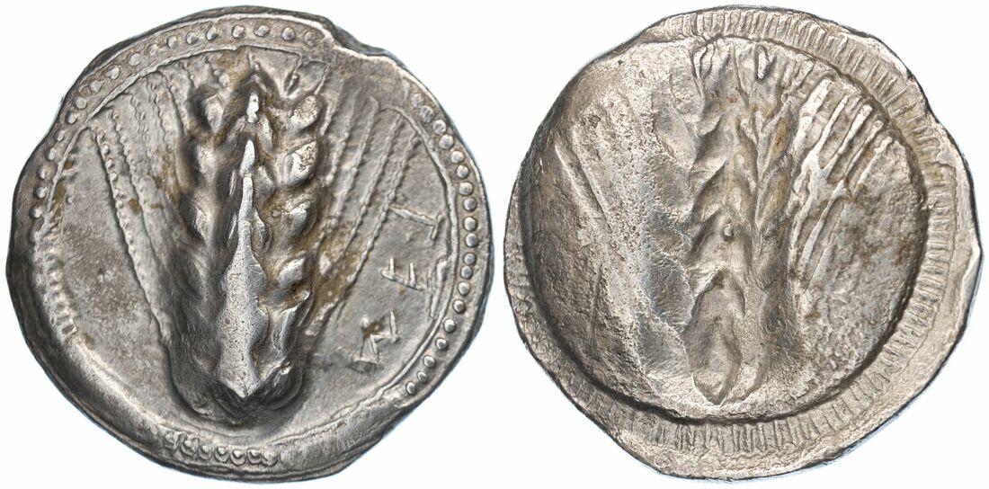 Lucania, Metapontion, AR Nomos, c. 510-470 BC, ear of barley with seven grains, retrograde MET to right, rev. incuse ear of barley with six grains, 7.31g (Noe Class IX, 191 (same dies); HN Italy 1482; SNG Ashmolean 657 (same dies)), bright flan, some softening to higher reaches but otherwise about very fine