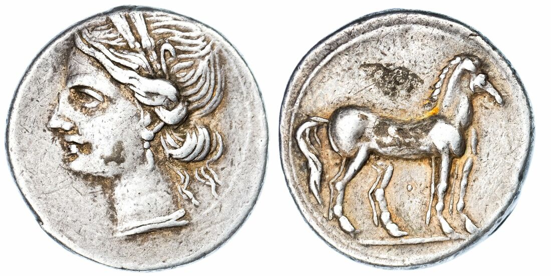 Bruttium, Carthaginian Occupation, c. 216-211 BC, AR Quarter-Shekel, Second Punic War issue, wreathed head of Tanit left, rev. Horse standing right, pellet below, 2.18g (CNP 27b; HN Italy 2015), lustrous, toned, very fine