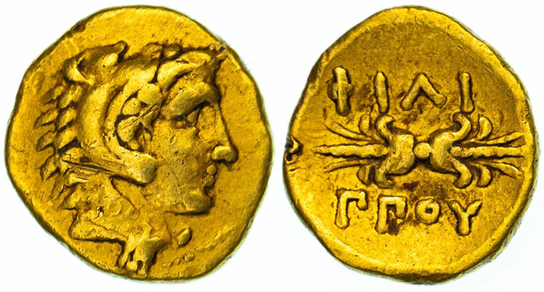 Kingdom of Macedon, Philip II (359-336 BC), AV 1/8 Stater, head of young Herakles right, clad in lions skin, rev.