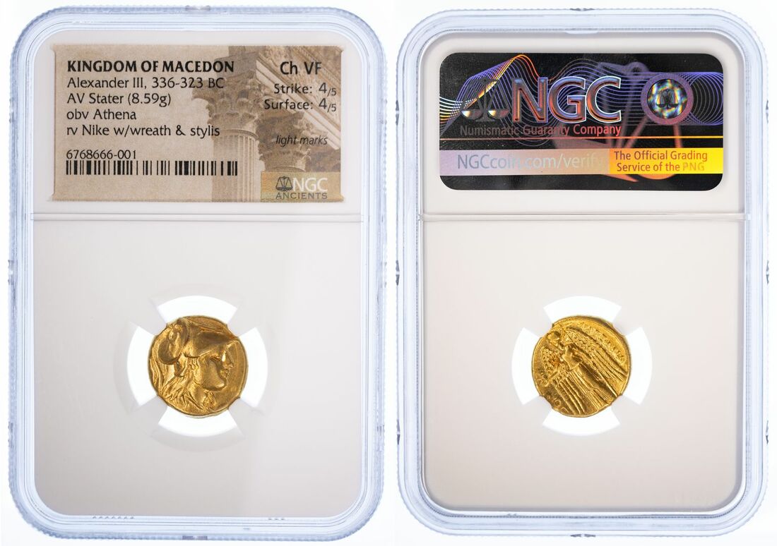 (x) NGC Choice VF | Kingdom of Macedon, Alexander III, 'The Great' (336-323 BC) AV Stater, Sardis, Lifetime Issue, c. 334-332, Head of Athena right, wearing crested and ornamented Corinthian helmet rev.