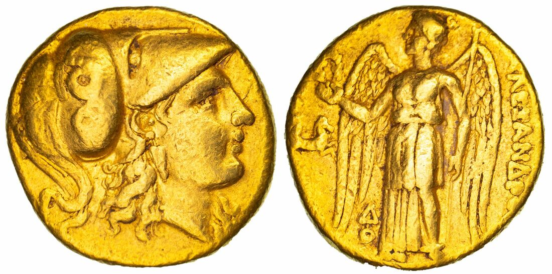 Kingdom of Macedon, Alexander III, 'the Great' (336-323 BC), AV Stater, Lampsakos, head of Athena right, wearing crested Corinthian helmet decorated with coiled serpent, rev.