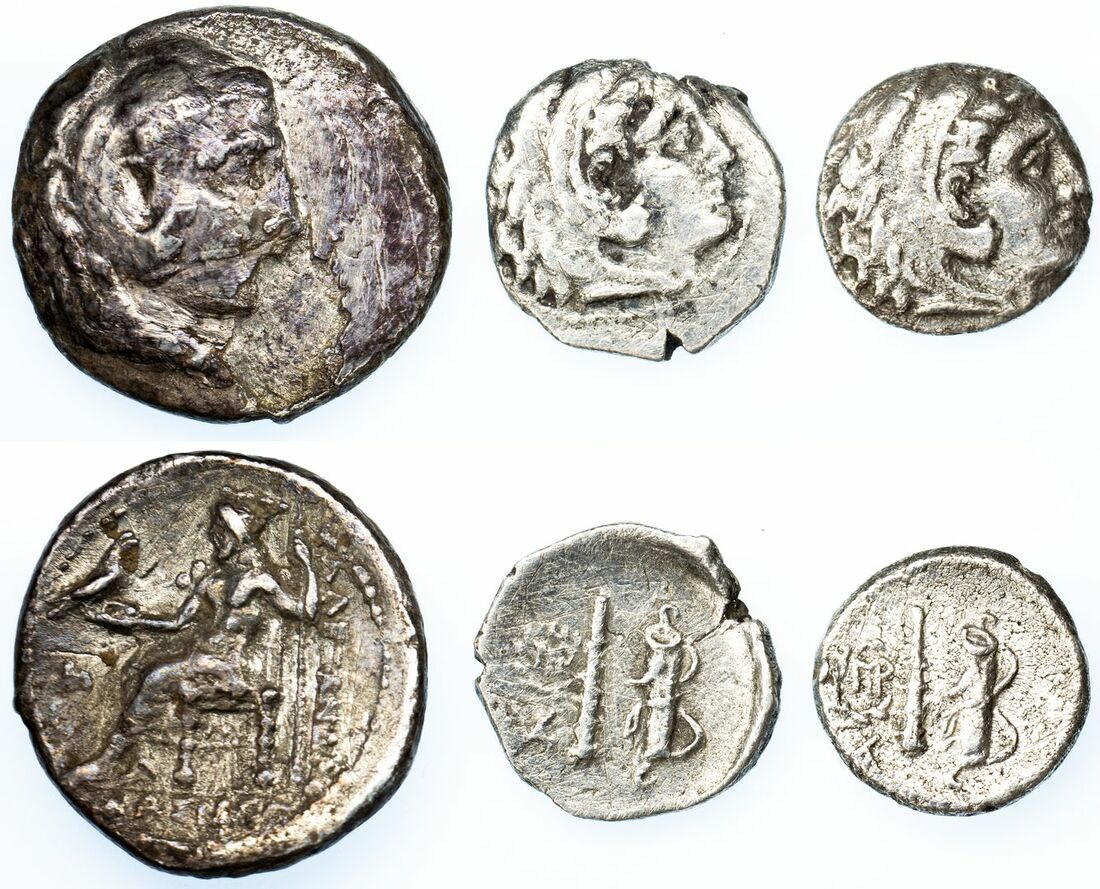 Kingdom of Macedon, Alexander III, 'the Great', a Trio of Silver (3): i) AR Hemidrachm, head of Herakles right, rev. Zeus Aetophoros enthroned, 1.91g (Price 3694), somewhat worn surfaces, about fine; ii) Obol, Babylon, obverse as before, rev. Club and quiver-over-bow, monogram within wreath above monogram to left, 0.54g, detailed, about very fine; iii) another, 0.50g, good fine to very fine; (3).