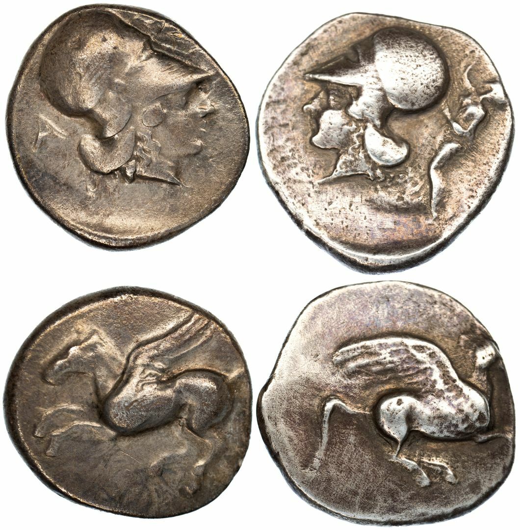 Colonies of Corinth, a Pair of Ambrakia Staters (2): i) c. 456-426 BC, Pegasos flying left, rev. head of Athena right, wearing Corinthian helmet, A behind, dancing satyr before (off-flan), 8.31g (Calciati 36; HGC 3.1, 203; Ravel 63 (A33/P42)), struck from worn dies, graffito to obverse, residually lustrous, good fine or thereabouts; ii) another, c. 404-360 BC, Pegasos flying right, rev. head of Athena left, wearing Corinthian helment, female standing left behind, holding kottabos pole, a softened legend to the edge, 7.85g (Ravel 106; Pegasi 68), worn to edges, but lightly toned and very fine (2).