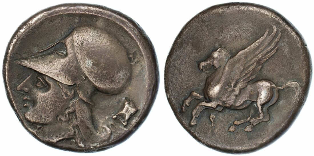 Corinthia, Corinth, AR Stater, c. 350-285 BC, Pegasos flying left, koppa below, rev. head of Athena left, wearing Corinthian helmet, astralogos behind,