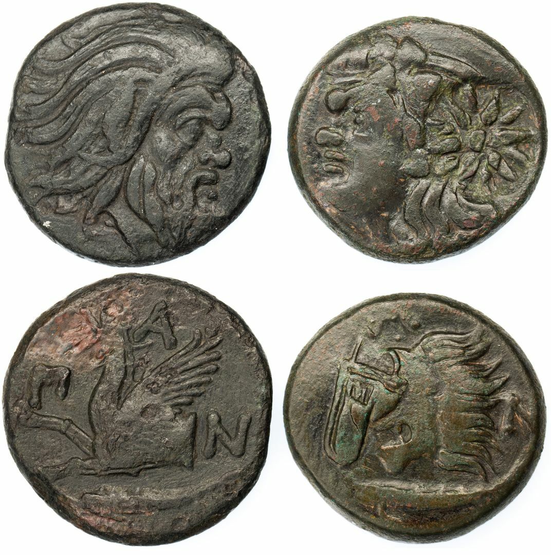 Kimmerian Bosphorus, Pantikapaion (2): i) AE, c. 325-310 BC, bearded head of satyr right, rev. PAN, forepart of griffin left, sturgeon left below, 7.09g (SNG Stancomb 542; MacDonald 69; SNG BM Black Sea 869-71; HGC 7, 113), well-struck light porosity to top of reverse, but otherwise very fine; ii) another, struck c. 265-245 BC, wreathed head of Pan left, c/m twelve-rayed star, rev. PAN, head of lion left, sturgeon left below, c/m bow in bowcase, 8.24g (MacDonald 70; Anohin 133; SNG BM Black Sea 883; SNG Copenhagen 37; cf. Agora 10, lot 21, for countermark placement), light patina, well struck and lustrous, good very fine or better; (2).