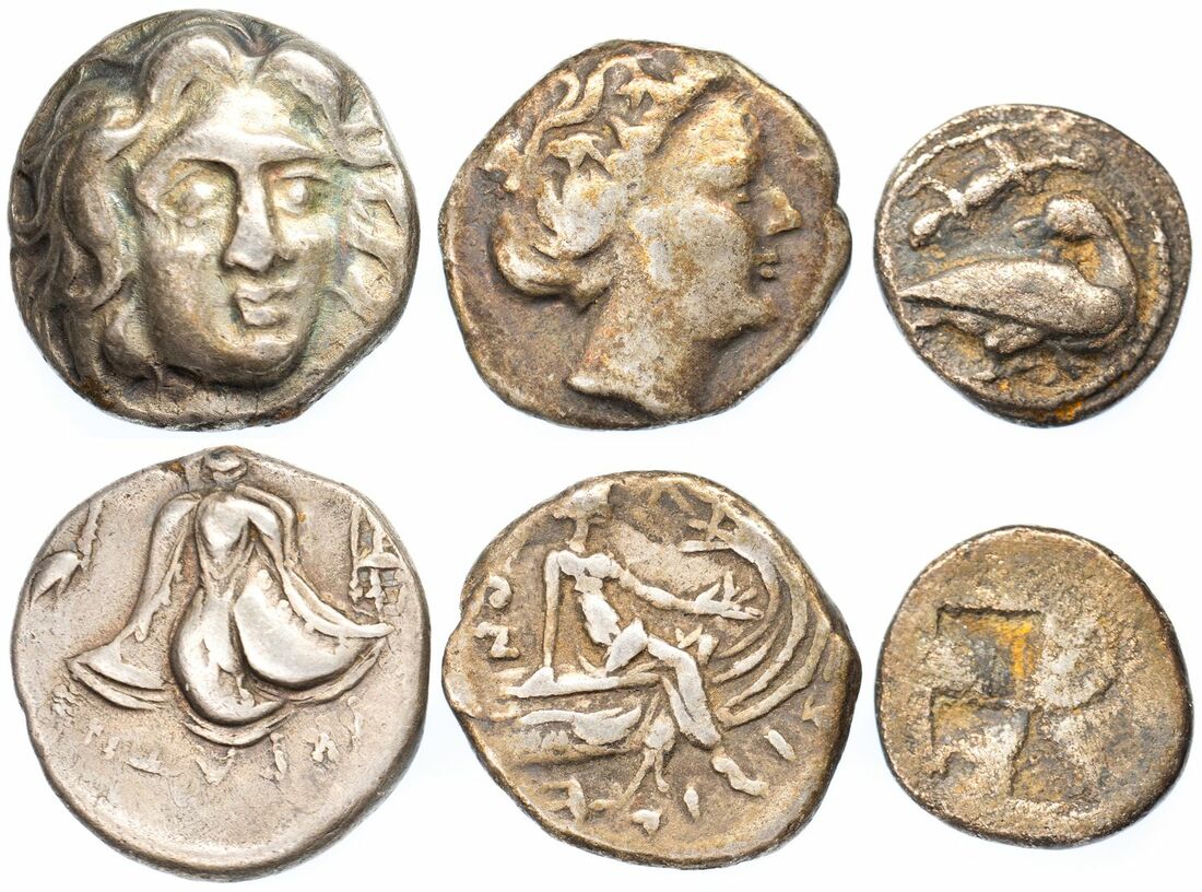Trio of Small Greek Silver (3): i) Macedon, Eion, AR diobol, c. 500-437 BC, goose standing right, looking backwards, lizard to left, rev. incuse sawmill pattern, 1.15g (SNG Copenhagen 175), toned, very fine; ii) Euboea, Histiaia, AR tetrobol, c. 250-146 BC, wreathed head of Maenad right, rev. Nymph Histiaia on stern of galley, trident below, wing on prow, 2.24g (SNG Copenhagen 527), softened but toned, fine to good fine; iii) Caria, Rhodes, AR Drachm, 166-88 BC, head of Helios facing slightly right, rev. EUKRATIS, rose with bus to right, tripod to left field, 3.14g (BMC 175; SNG von Aulock 2814; SNG Keckman 559; SNG Kayhan 914; SNG München 587), toned, good fine; (3).