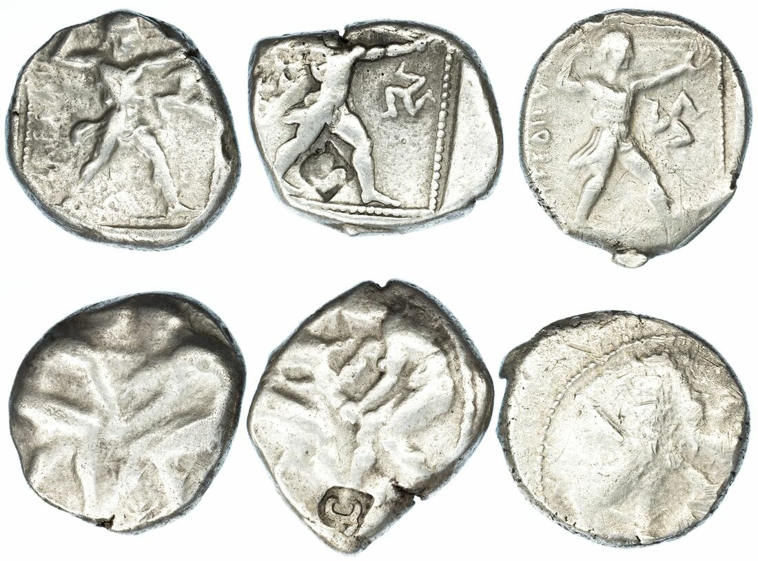 Trio of Aspendos Didrachmae (3): all with two wrestlers, facing each other and grappling, rev. slinger standing right, preparing to launch missile, with trikseles to right field: i) triskeles running left, 10.83g, fine; ii) triskeles running left, countermark on both obverse and reverse, 10.86g, fine to good fine; iii) triskeles running right, 9.905g, near very fine; (3).