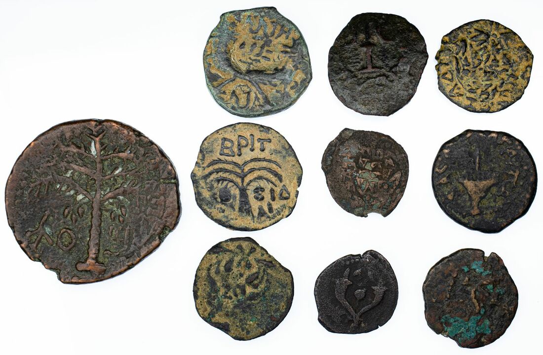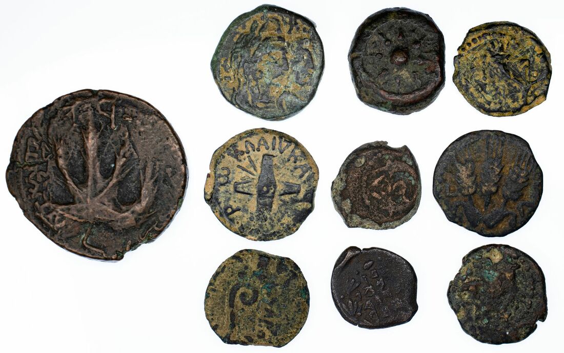 Selection of Nabatean and Judean Bronze (10) i) Nabatea, 1.65g; ii) Nabatea, Aretas IV, 9 BC-AD 40, Queen Shagilatti two cornucopiae 4.32g; iii) Nabatea, Rabbell II 3.95g; iv) Alexander Jannaeus Hendin 17 struck over Hendin 17 'High priest' Prutah 1.79g; v) Judea Agrippa (AD 37-44) three ears of barley, 2.23g; vi) Alexander Jannaeus Hendin 14 inscription in wreath, double cornucopiae, 1.96g; vii) Antonius Felix Prutah BRIT KAI type, Hendin 117, (ex. Leeds Musum Exhibit 6/5 Autumn 1994), 2.46g; viii) 1.77g Herod the Great, anchor and double-cornucopiae; ix) double cornucopiae with legend in wreath, 1.25g ; x) Bar Kokhbar Revolt AE 26 3rd year, 11.19g, Hendin 173; ranging from good to fine, an interesting selection of paleo-Hebrew coinage (10)