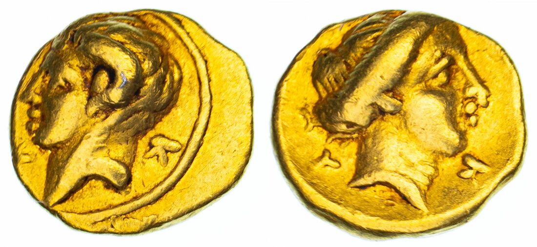 Kyrenaika, Kyrene, AV Litra (1/10 Stater), c. 322-313 BC, head of youthful Apollo Karneios left, with horn of Ammon, K-Y across, rev. female head right,