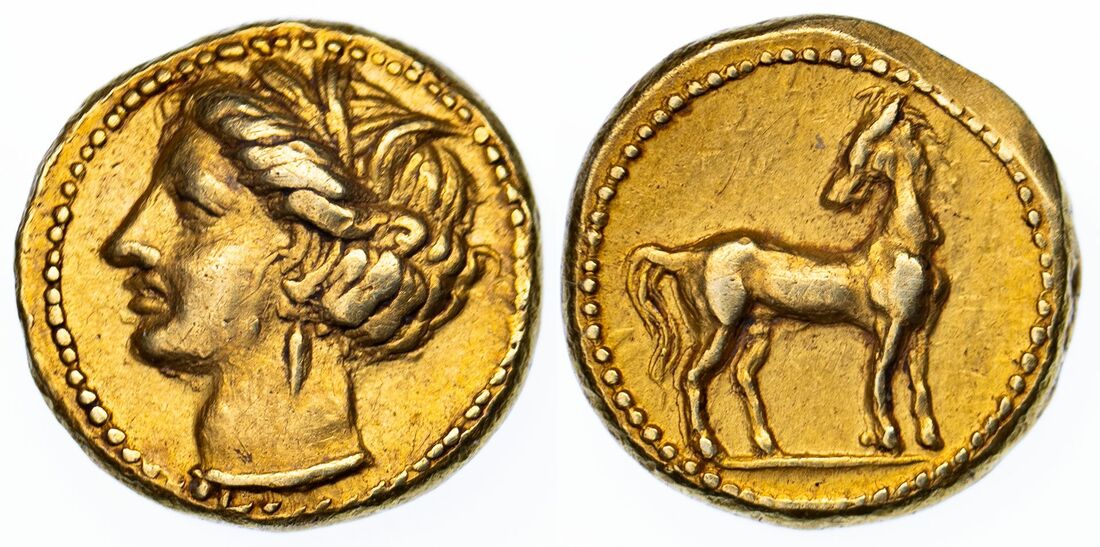 Zeugitana, Carthage, EL 1/5 Stater, c. 350-320 BC, head of Tanit left, rev. horse standing right, looking backwards, 1.50g (Jenkins & Lewis 129), lovely portrait, some wear to reverse but otherwise about very fine