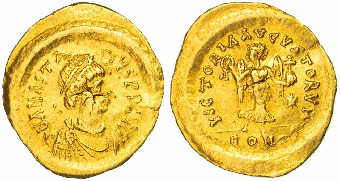 Byzantine Empire, Anastasius, 491-518, AV Tremissis, D N ANASTASIVS P P AVG, pearl-diademed, draped and cuirassed bust right, rev. VICTORIA AVGVSTORVM, Victory advancing right, head to left, holding wreath in her right hand and globus cruciger in her left, star to right field, CONOB in exergue, 1.48g (DOC 10a; MIB 12; SB 8), scratches to portrait and centre of flan, deposits within, yet a well-struck example, fine to very fine