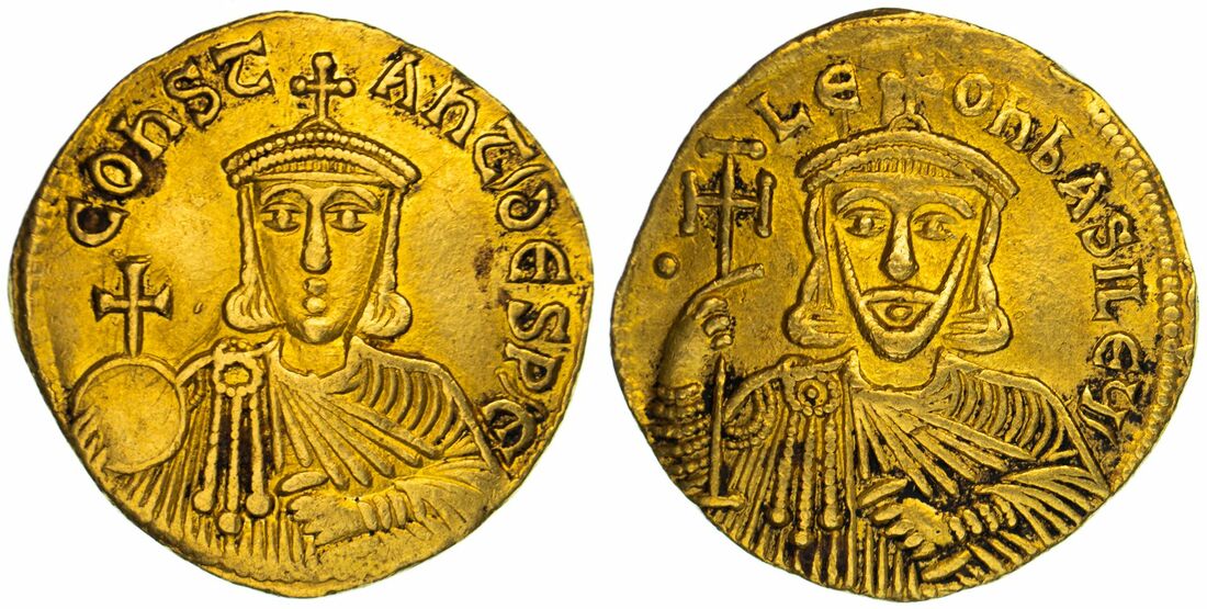 Byzantine Empire, Leo V 'the Armenian' and Constantine (813-820), AV Solidus, Constantinople, bust of Leo V facing, with slight beard, wearing crown and chlamys, cross potent in right hand, akakia in left, pellet beside, rev. bust of Constantine facing, beardless, wearing crown and chlamys, globus cruciger in right hand, akakia in left, 4.40g, 7h (DOC 2b; SB 1627), deposits in recesses otherwise honey-golden tone with wisps of lustre, a pleasing very fine, rare
