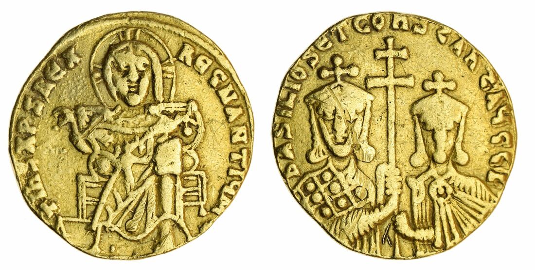 Byzantine Empire, Basil I with Constantine (867-886) AV Solidus, IhS XPS REX REGNANTIUM*, Christ Pantokrator enthroned facing rev. bASILIOS ET COhSTANT AVGG b, crowned facing busts of Basil, with short beard and loros, and Constantine, beardless and wearing chlamys, holding patriarchal cross between them, 4.33g (SB 1704), slightly softened on a short flan but lustrous, very fine