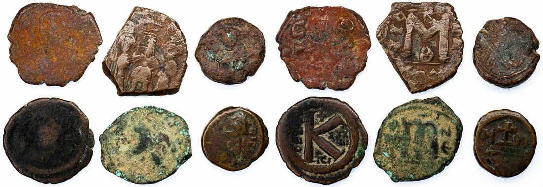 Byzantine Empire, a Selection of Bronze (6): i) Justinian I, 20 Nummia, c. AD 564 Thessalonica, 5.05g (Museum release, 10 75); ii) Justin II Antioch Follis, AD 572, 4.82g; iii) Maurice Tiberius AE, Cross potent, letters each side, 3.66g (SB 566); iv) Heraclius, 40 Nummia of Thessalonica, Arab imitation with with Leeds City Museum ticket, 4.84g; v) Constans II AE, oblong flan, emperors facing, 5.52g ; vi) Anonymous, legend in four lines, 5.52g; (6)