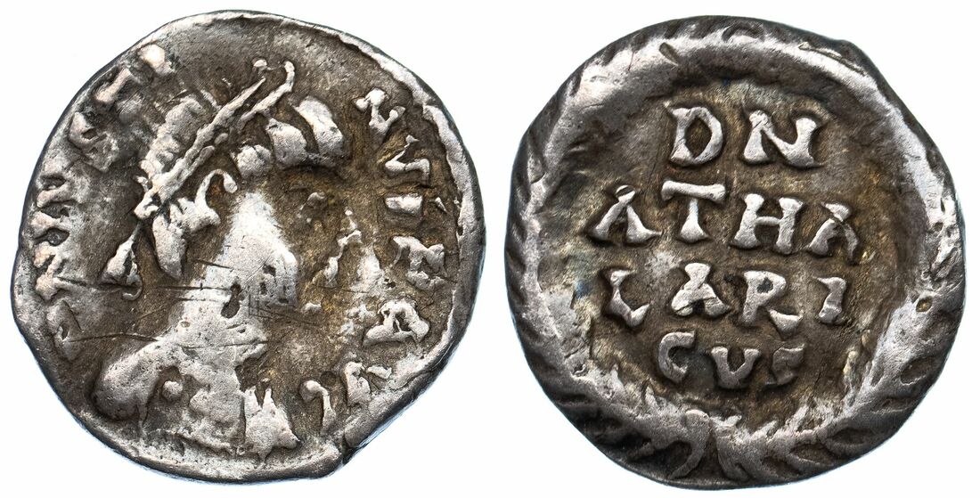 Ostrogoths in Italy, Athalaric, AR 1/4 Siliqua. In the name of Justinian I, Ravenna, c. AD 527-534, D N IVSTINIAN AVG, diademed bust right, wearing 'Ostrogothic' garment, rev. D N ATHALARICVS in four lines within wreath, 0.71g, (cf. MEC 127 (Rome); BMC Vandals 35; Ladich 24), slightly worn to obverse, reverse well preserved, toned, good to fine