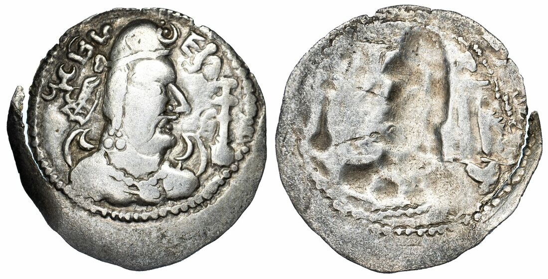 Hephthalite, Alchon Huns, Javukha (c. 460-520), Drachm, 3.60g, crowned bust of king right, symbol in right field, tamgha behind head, Brahmi legend naming Javukha at top, rev. traces of fine altar, but mostly blank (Gobl, Dokumente, Em. 51; MAC 1437-40), edge torn, about very fine, scarce