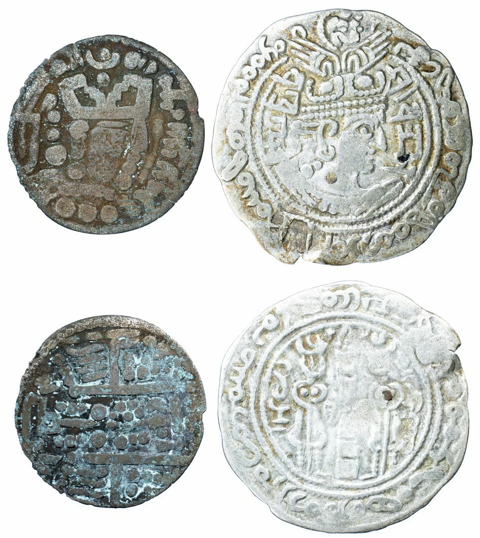 Turko-Hephthalite, Vasu Deva (Sri Vajara Vakhudeva) (c. 620-80), Drachm, 3.28g, bust of king right wearing winged crown with head of lion above, gold insert in neck, rev. fire altar with attendants, legends in both Pahlavi and Brahmi (Gobl, Dokumente, Em. 244; Sunrise 1037var), with usual Hephthalite countermark, toned very fine / about very fine, scarce; Kings of Bukhara, Bactria (c.700-85), base metal Drachm, 1.86g, bust of king right, rev. crude representation of fire altar and attendants (MAC 1395-6), fine, both with designs copied from those on Sasanian coins (2)
