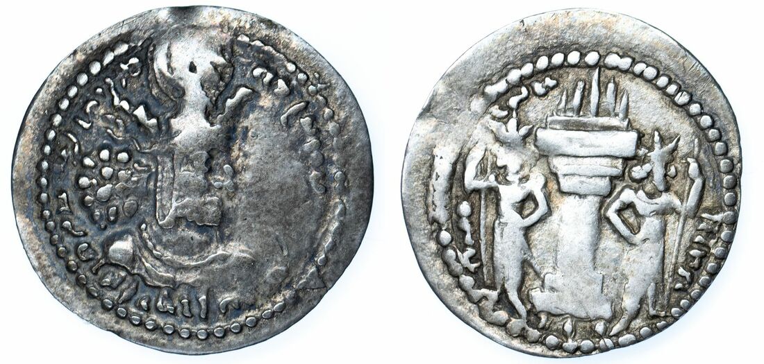 Sassanid Persia, Shapur I (240-72), AR Obol, 0.60g, mint I ("Ctesiphon"), Shapur right wearing diadem and mural crown with korymbos, rev. fire altar flanked by two attendants wearing crowns (Go¨bl type I/1; Saeedi 85; Sunrise 735), about very fine, scarce