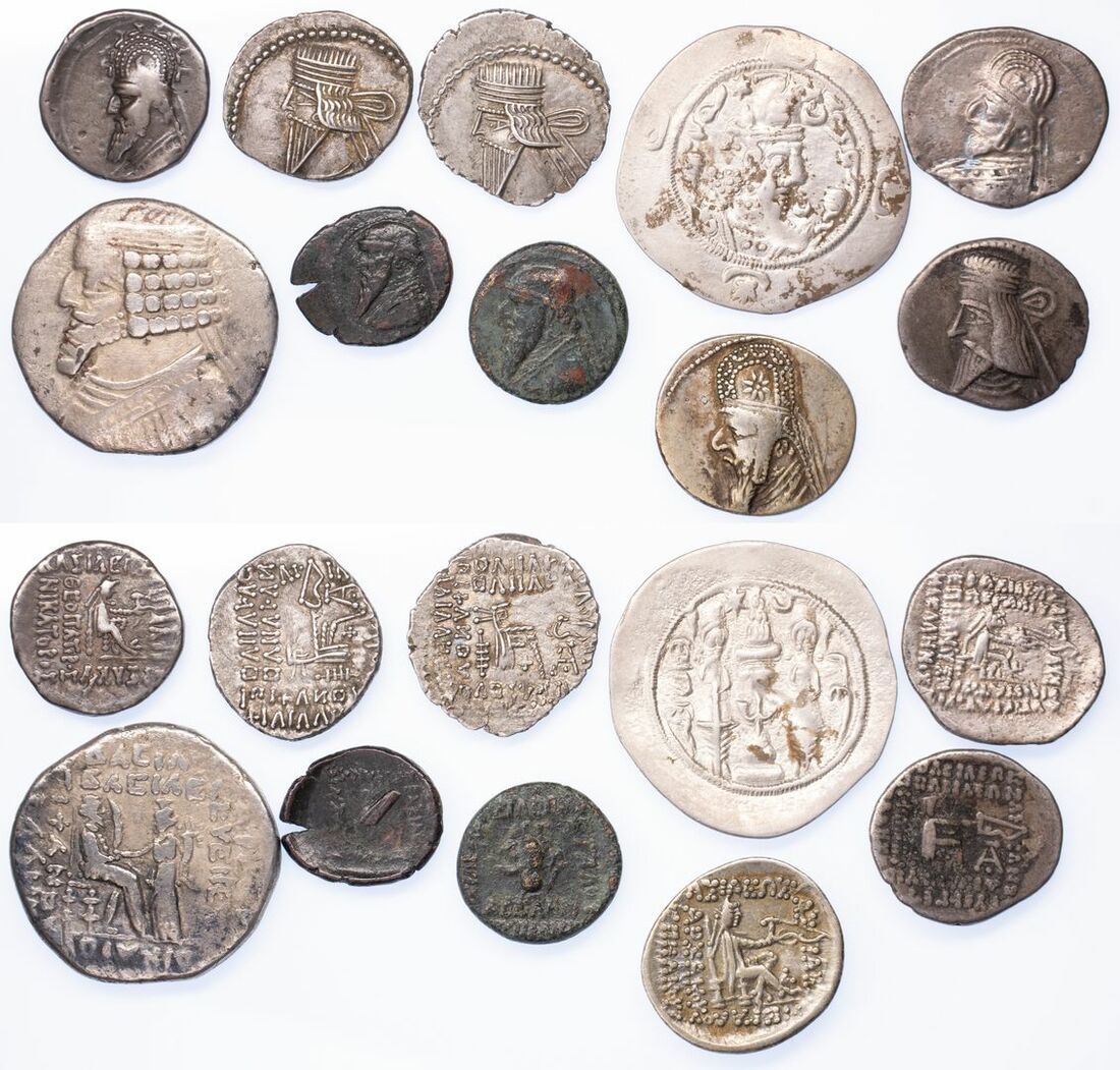 Parthian and Sassanid Selection (10): Mithradates II (121-91 BC) (2): i) AE Tetrachalkon, bust with long beard left, rev. Pegasos flying right, 3.22g (Sellwood 27.7), red patina, fine; ii) AE Chalkous, obverse as before, rev. bowcase, 2.20g (Sellwood 27.12), good to fine; iii) Gotarzes I (95-90 BC), cuirassed bust left, wearing diara, rev. archer seated right, 3.43g (Sellwood 33.4), near fine; iv) Orodes I (80-77 BC), diaded bust left, wearing tiara, rev. as before, 3.96g (Sellwood 31.5), toned, fine; v) Sinatruces (c. 75-69 BC), as before, 3.92g (Sellwood 33.3), softened, good to fine; vi) Phraates IV (c. 38-2 BC), AE Tetradrachm, diademed bust left, rev. Phraates seated right, receiving palm from Tyche standing right, holding cornucopiae, 14.07g (Sellwood 51.4), good to fine; vii) Artabanus II (AD 10-38) diademed and cuirassed bust left, bearded, rev. as before, 3.65g (Sellwood 61.7), about fine; viii) Pakoros I (AD 78-120), Ektabana, diademed bust right, rev. seated right on throne, holding bow, monogram below bow, 3.77g (Sellwood 78.5 (Vologasses III) toned, good fine to very fine; ix) another, as before, 3.77g (Sellwood 78.4 (Vologases III); Shore -; Sunrise 439), struck off-centre, good fine; Sassanid Persia, Hormazd IV (AD 479-490), AR Dirham, Jay Mint, dated Year 12, crowned head right, rev. fire-altar with two attendants to the sides, 4.03g (Göbl I/1), fine (10).