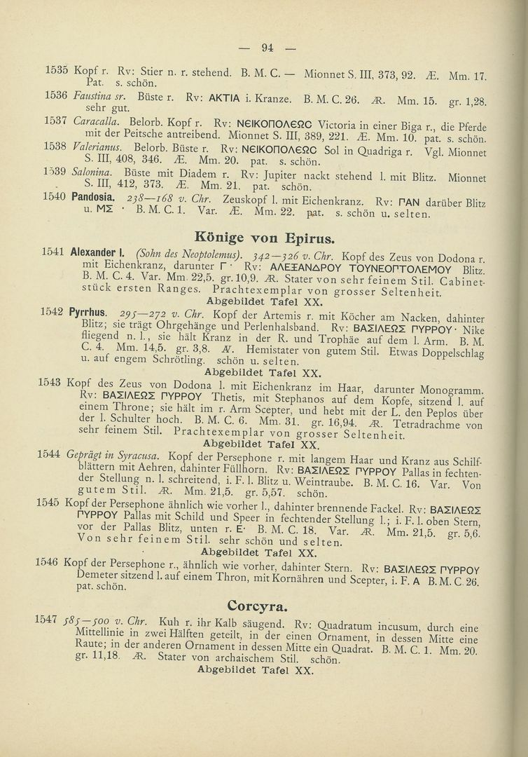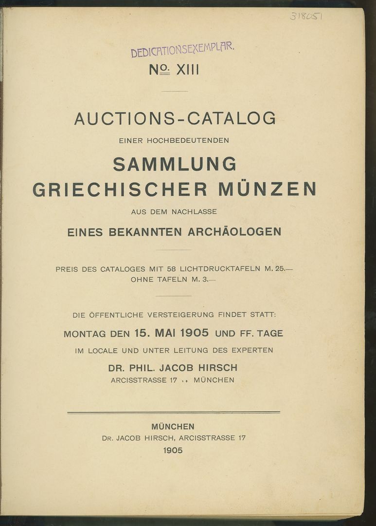 Catalogue of Jacob Hirsch Auction No. XIII (15 May 1905), Including Collection of Athanasios Rhousopoulos, Eine hochbedeutenden Sammlung griechischer Münzen aus dem Nachlasse eines bekannten Archäologen, Munich, 292 pp. plus prices realised and plates, leatherbound, (Clain-Stefanelli 1941), containing the important collection of Greek coins assembled by archaeologist Athanasios Rhousopoulos, a highly sought-after catalogue in excellent condition