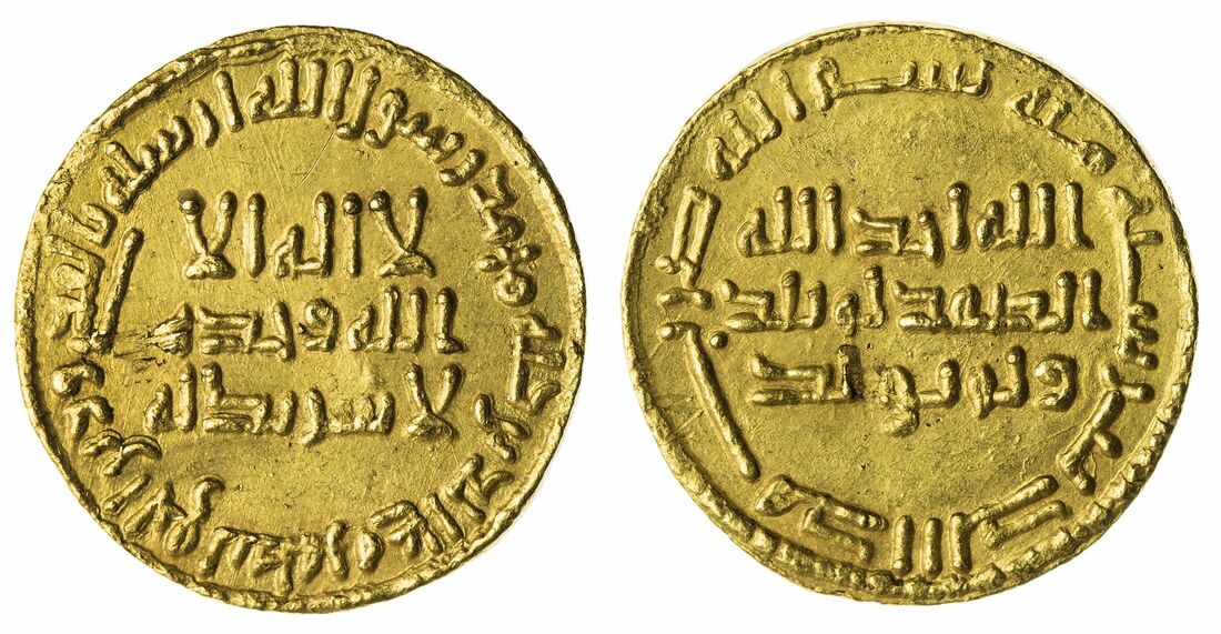 (x) Umayyad, time of `Umar (717-720), gold Dinar, 4.28g, mintless type (Damascus), AH 100 (Album 132; Bernardi 43), some superficial damage to a couple of letters, about extremely fine and scarce