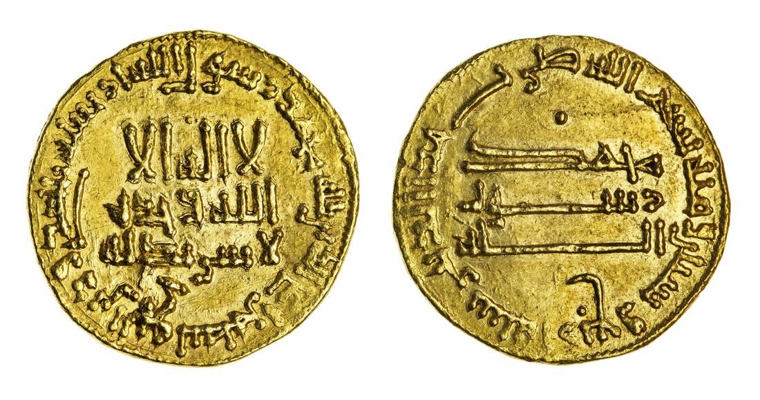 Abbasid Dynasty, temp.al-Mahdi (158-169), gold Dinar, 4.25g, mintless type, AH164, pellet at top of reverse field (Album 214; Bernardi 51), unobtrusive edge weakness from old mount, otherwise gem about uncirculated