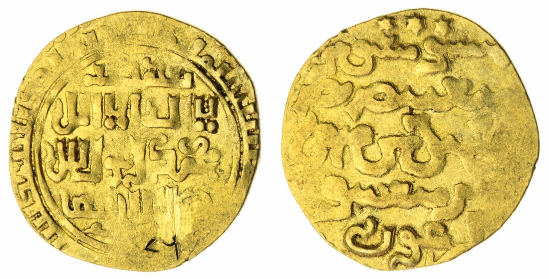 Ilkhan, Arghun (1284-1291), gold Dinar, 4.36g, mint off flan, in style of Tabriz, AH68-, Uighur legend on reverse (Album 2144), Arabic number '76' engraved at bottom of obverse, good fine, scarce