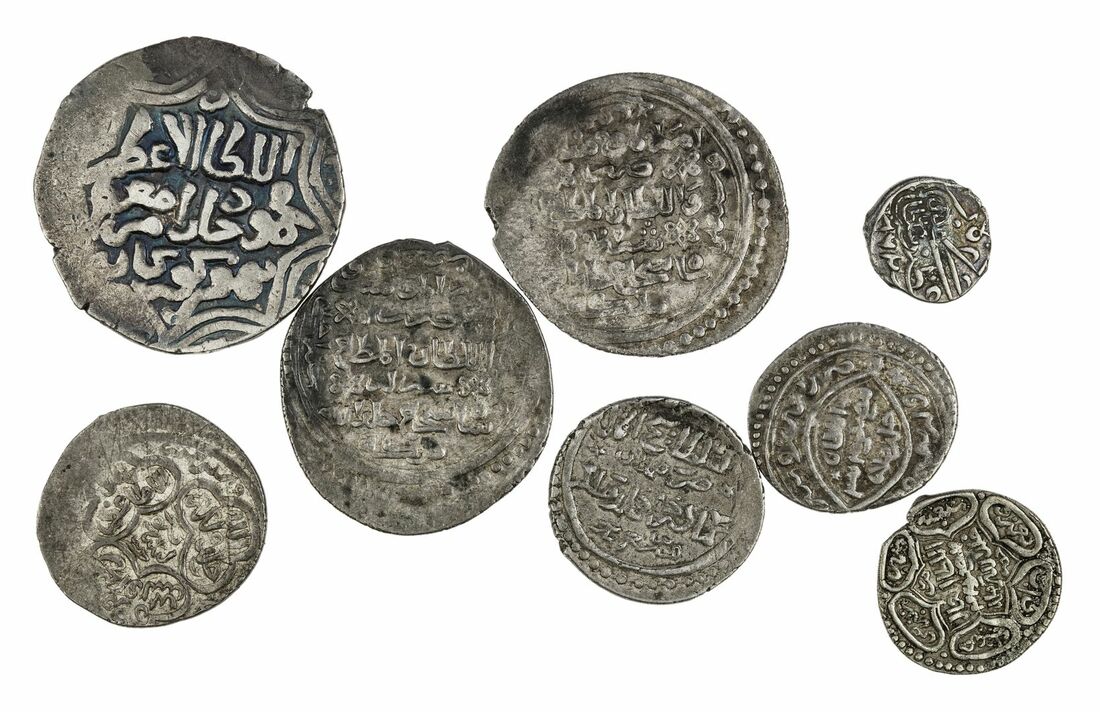 Ilkhan, Sulayman (1339-1346), 2-Dirhams (2), type D, 1.39g, Tabriz, AH743; type G, 1.39g, Hisn, AH745 (Album 2254, 2257), very fine and good very fine; Jalayrid, Shaykh Uways I (1356-1374), Dinar (2), type TB, 2.21g, Hamadan, probably AH764; type TC1, 2.06g, Kustasba, AH766 (Album 2300.2, 2300.3), both very fine overall, scarce; Muzaffarid, Shah Shuja (1358-1386), 2-Dinars (2), both Shiraz, one dated AH771 (Album 2282.7), very fine and about very fine; Timurid, Timur Ghurkhan (1370-1405), Tanka, 6.19g, mintless (possibly Herat), undated, as vasal of Mahmud Khan Chagatai (Album 2386), edges weak, toned fine, together with another unidentified Akce, 0.71g, clearly dated 862, and countermarked 'adl sultan, intriquing, good fine/ fine, presumably rare (8)