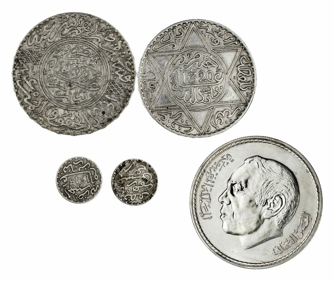 Morocco, Moulay al-Hasan I (1873-1894), 10 Dirhams, AH1299 / 1882, security edge, 12h, 29.08g (KM Y8), minor friction marking, otherwise lustrous and light hues of tone, about extremely fine; Half-Dirham, AH1310 / 1893, milled edge, 12h, 1.46g (KM Y4), very fine; another, AH1313 / 1896, milled edge, 12h, 1.39g (KM Y4), very fine; Abd al-Aziz (1894-1908), 10 Dirhams, AH1320 / 1903, security edge, 12h, 24.91g (KM Y22.1), cleaned, otherwise bolder very fine; al-Hassan II (1962-1999), Frosted Proof 50 Dirhams, AH1396 / 1976, Anniversary of Green March, milled edge, 6h, 35.31g (KM Y68), some minor pinmarks, otherwise with hues of ochre toning to the peripheries to brilliant fields, extremely fine