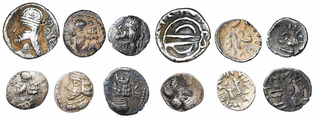 Ancient Persis, Uncertain King (ca. 1st century AD). AR Hemidrachm, 1.63g, diademed, draped bust of king left, with pointed beard, wearing Parthian tiara with ear flap, rev, diadem with ties (for type see Sunrise 649 Obol), very fine; AR Obols (6), including issues of Ardashir II; Darius II; Pakor I/II; Vashir, and uncertain king, a good variety of types with clear designs, generally very fine (7)