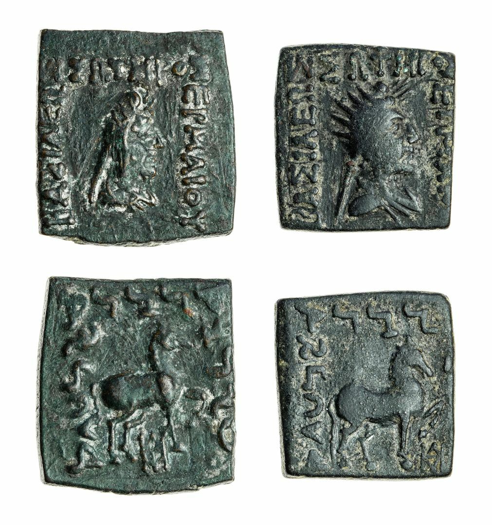 Indo-Greek Kingdom, Hermaeus (c.40-1 BC), square AE Units (2), 8.65g; 7.71g, bearded bust of Zeus/Mithra right, wearing Phrygian cap, rev. horse standing right, one hoof raised, monogram in different place on each coin (Bopearachchi 9B/D; SNG ANS 1348, 1353; M.416, 7), both very fine or a little better, better than average for type (2)