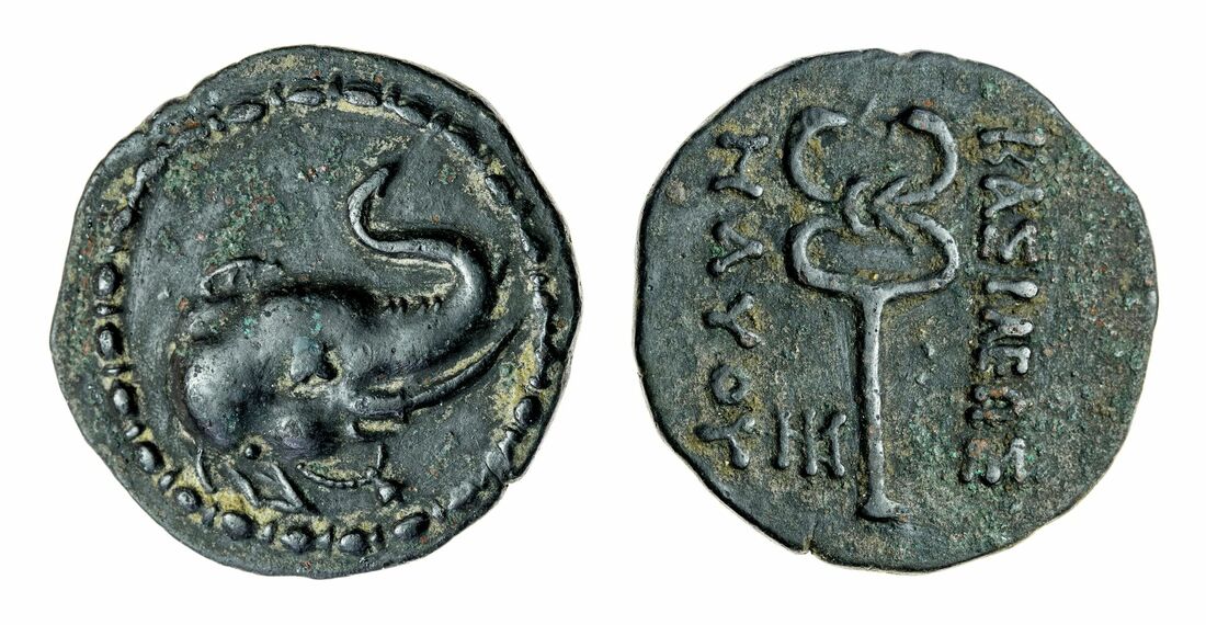 Indo-Scythian, Maues (c.90-57 BC), AE Unit, 9.29g, head of elephant right with trunk raised within a reel and pellet frame, rev. caduceus framed by Greek legend, monogram bottom left (Senior 5.1; M.707; MAC 2196), with some natural deposit remaining on surfaces, attractive good very fine