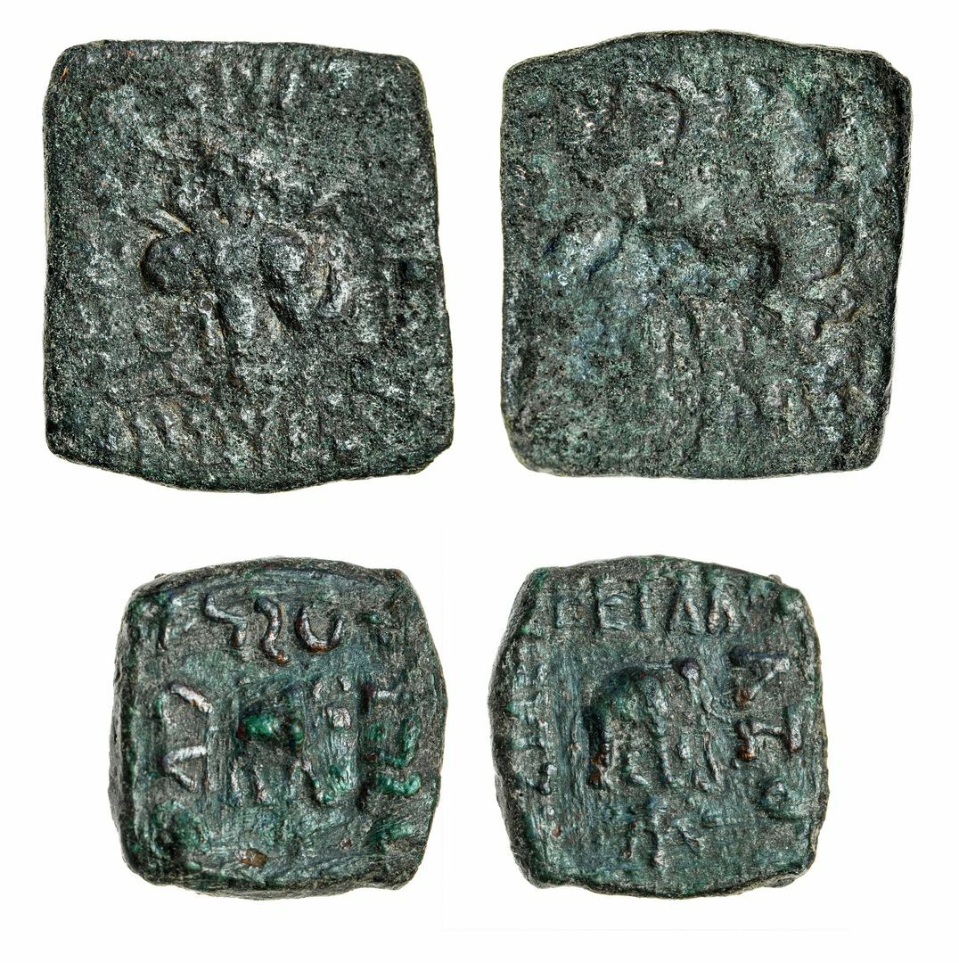 Indo-Scythian, Azilizes (57-35 BC), square AE Unit, 9.08g, horse rider facing left, rev. zebu standing left, monograms above (Senior 55.1; see also CNG 87, lot 757, 121 lot 674), in poor condition, but very rare, said to be one of only five known; Indo-Scythian, Azes (c.58-12 BC), square AE Chalkous, 1.82g, Taxila, elephant standing right, monogram beneath, Greek legend, rev. zebu standing right, kharoshthi legend (Senior ISCH 2.110; M.822; MAC 2302), heavily cleaned but overall very fine and rare (2)