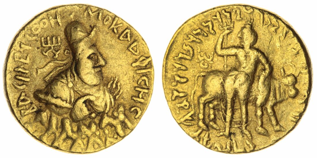 Kushan Empire, Vima Kadphises (c.113-127), gold Double Dinar, 16.01g, bilingual series, Bactria, bearded bust of king right emerging from jagged mountain top, wearing a high-crowned hat with upturned peak, carrying a club over shoulder, the forefinger of his right hand is enlarged, flames radiate from shoulder right, tamgha in left field, legend around starting at 7 o'clock: